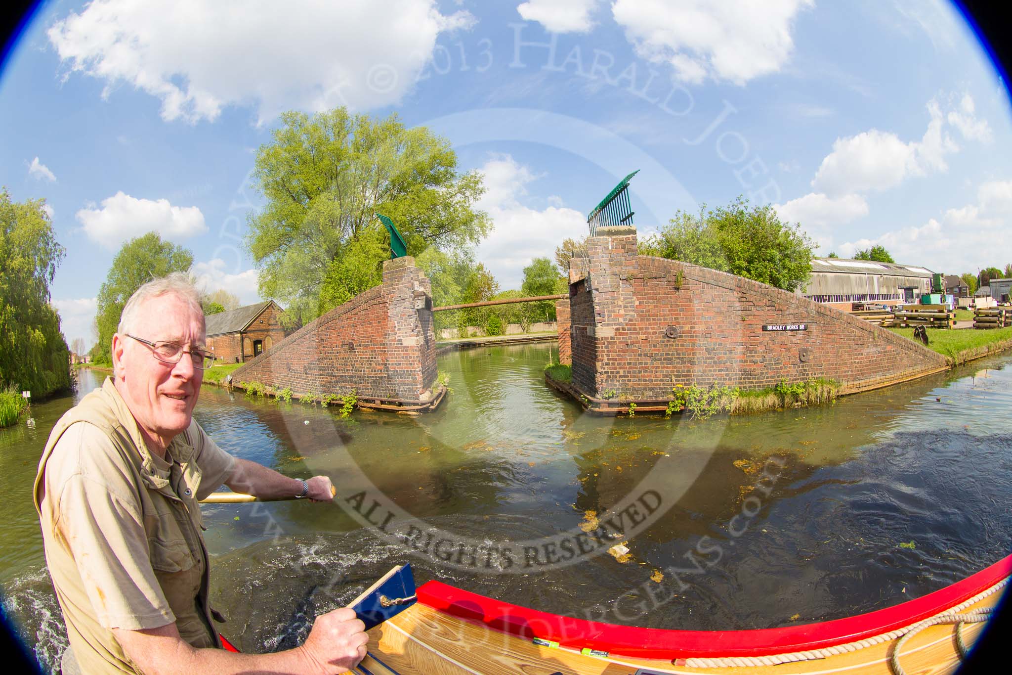 BCN Marathon Challenge 2013: Skipper Charley on board of NB "Felonious Mongoose" at Bradley Works Bridge, the entrance to the British Waterways Bradley Workshops at the end of the Bradley Branch.. Birmingham Canal Navigation, United Kingdom, on 25 May 2013 at 16:08, image #227