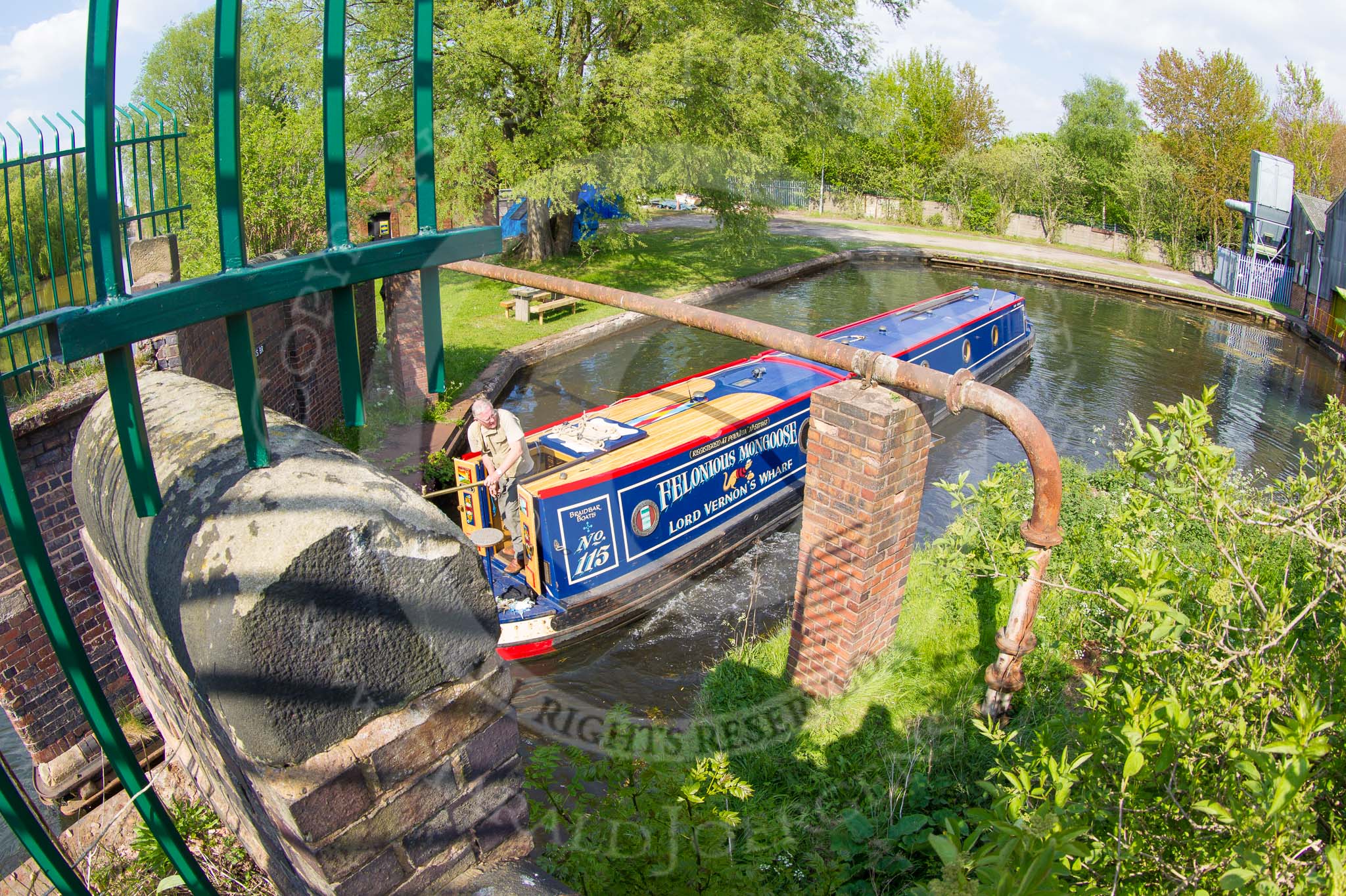 BCN Marathon Challenge 2013: NB "Feloinous Mongoose" leaving the basin at Bradley Workshops, at the end of the Bradley Branch. The basin is part of a former, longer look of the Wednesbury Oak Loop that had been shortened.. Birmingham Canal Navigation, United Kingdom, on 25 May 2013 at 16:18, image #236