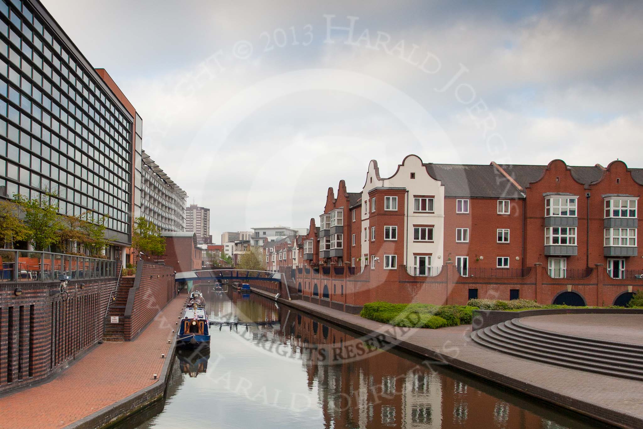 BCN Marathon Challenge 2013: Old Turn Junction, in the centre of Birmingham, looing towards Oozells Street Loop, with the Main Line, leading to Broad Street Tunnel, on the left. NB "Felonious Mongoose" has just left Sheepcote Street Bridge, the two narrowboats in front will also take part in the BCN Marathon Challenge.. Birmingham Canal Navigation, United Kingdom, on 25 May 2013 at 07:41, image #18
