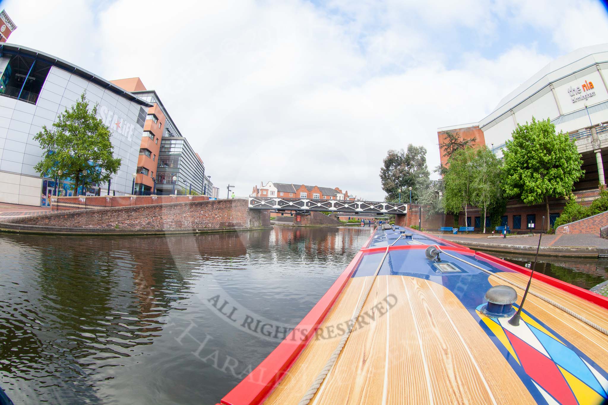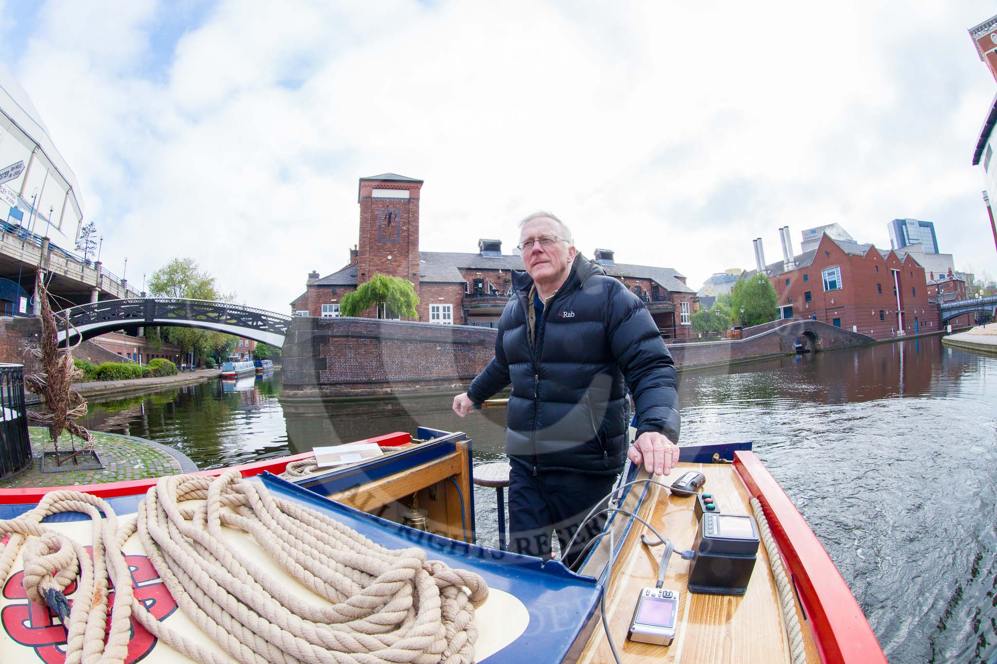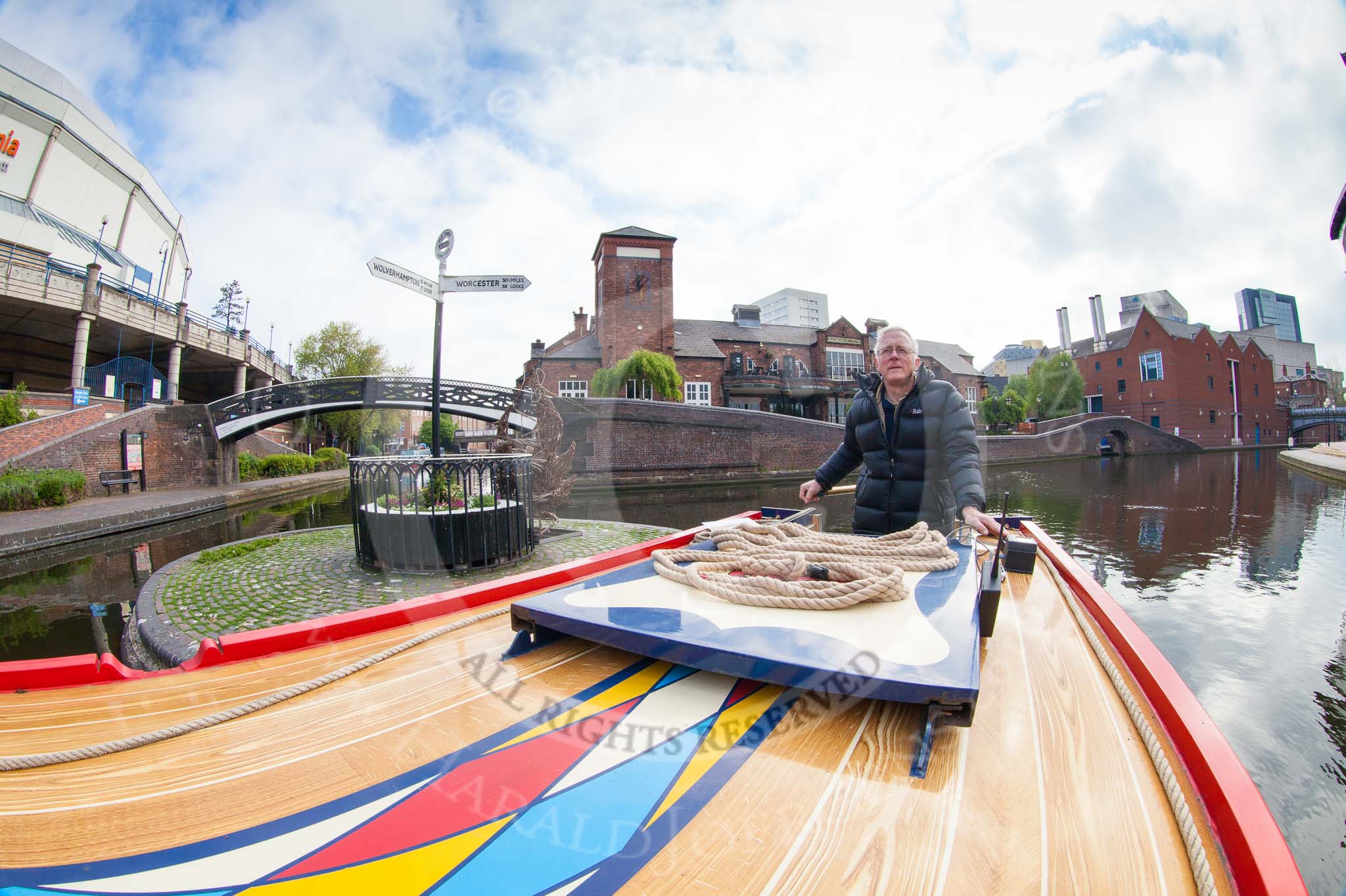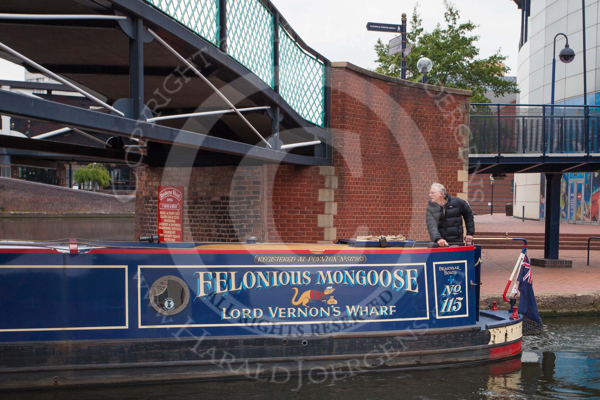 BCN Marathon Challenge 2013: NB "Felonious Mongoose", at Old Street Junction in the centre of Birmingham, minutes before the start of the BCN Marathon Challenge. On the right the NIA Birmingham, the National Indoor Arena, on the left the "Sealife" aquarium.. Birmingham Canal Navigation, United Kingdom, on 25 May 2013 at 07:53, image #24