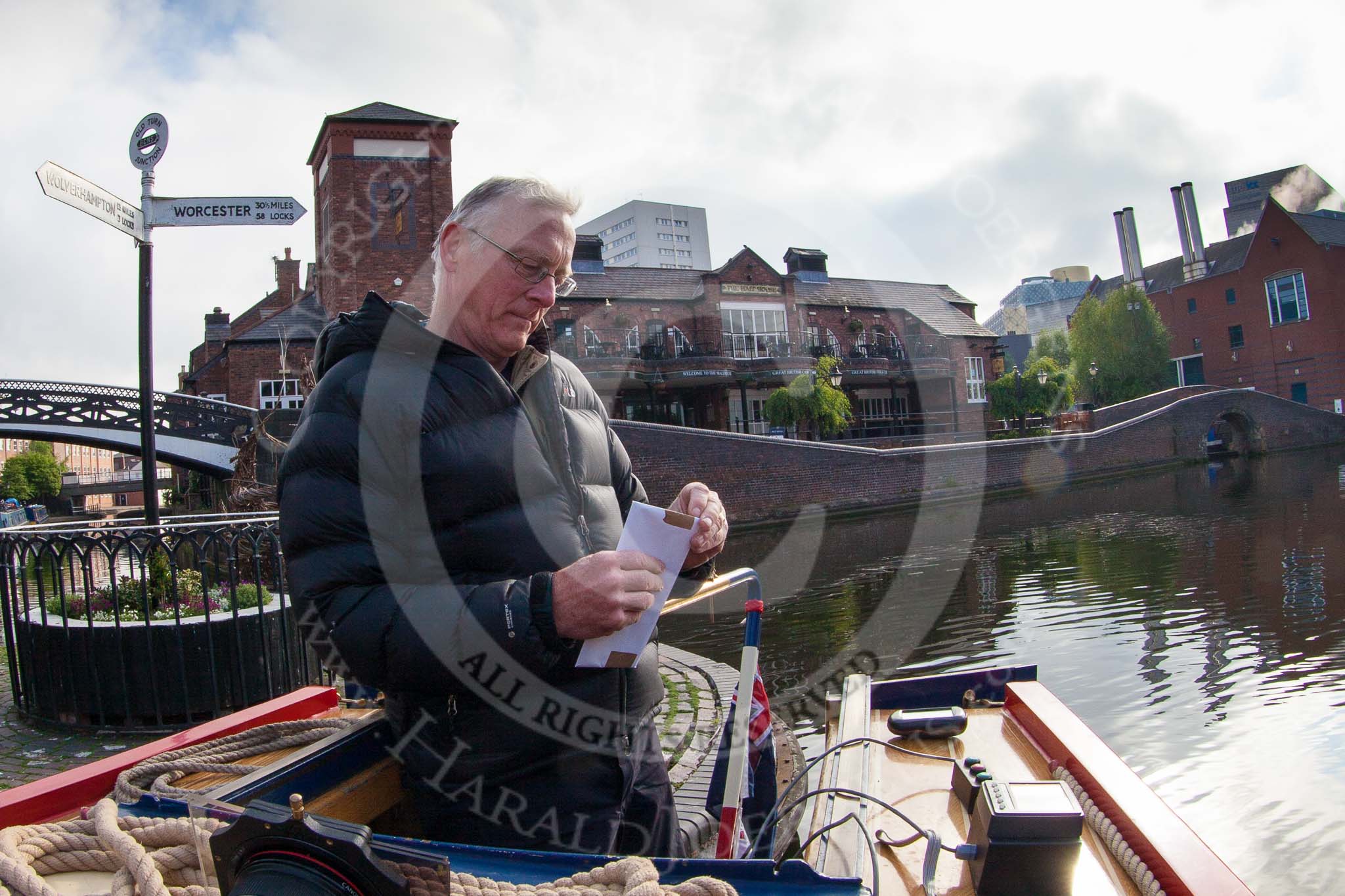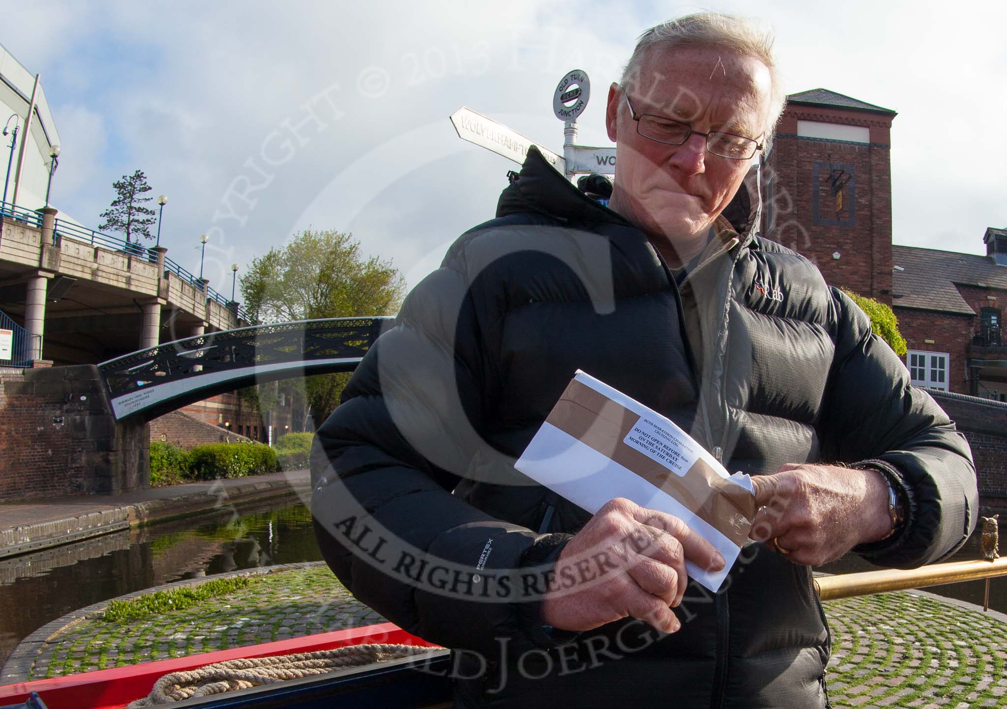 BCN Marathon Challenge 2013: Skipper Charley on board of NB "Felonious Mongoose", at Old Street Junction in the centre of Birmingham, at the start of the BCN Marathon Challenge, opening the sealed envelope with the challenges.. Birmingham Canal Navigation, United Kingdom, on 25 May 2013 at 07:58, image #28