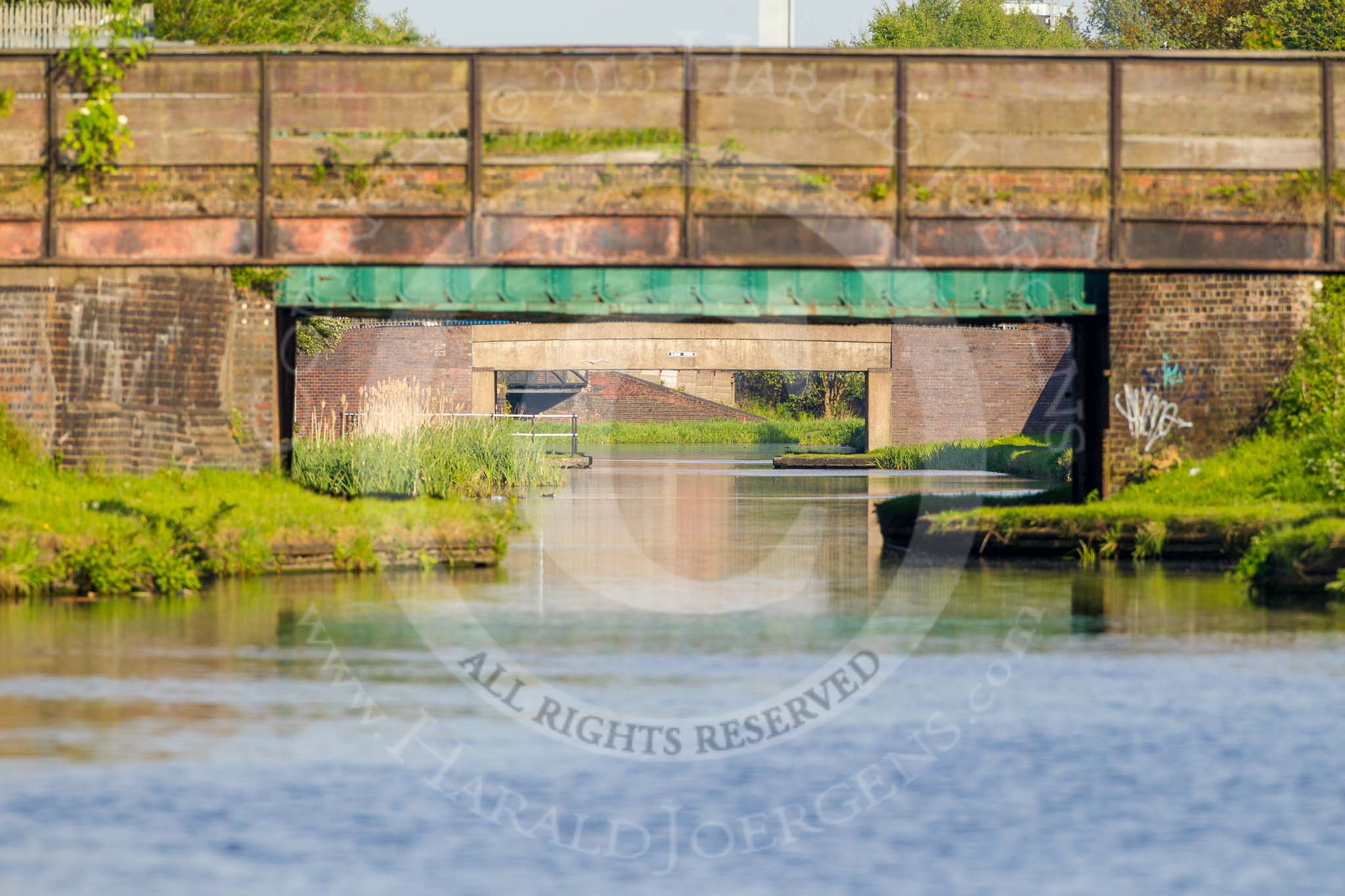 BCN Marathon Challenge 2013: Four bridges in line - the BCN New Main Line, east of Pudding Green Junction. The first is a foot bridge, the second a railway bridge, the third Albion Bridge, carrying Oldbury Road over the canal, and the fourth is a factory bridge well behind Pudding Green Junction. The distances appear compressed as a long lens was used.. Birmingham Canal Navigation, United Kingdom, on 25 May 2013 at 18:47, image #297