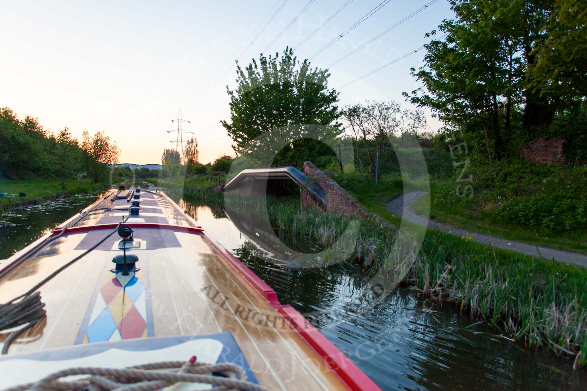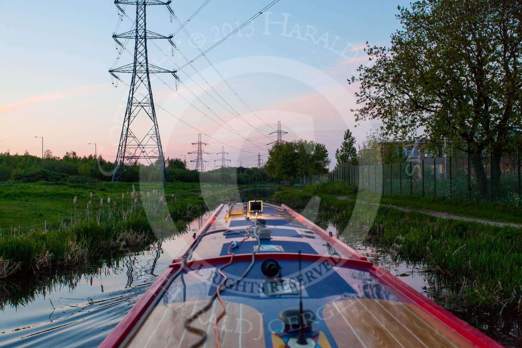 BCN Marathon Challenge 2013: Fading daylight, at 9:20pm, on the Walsall Canal in Darlaston, with additional light installed on board of NB "Felonious Mongoose".. Birmingham Canal Navigation, United Kingdom, on 25 May 2013 at 21:19, image #314