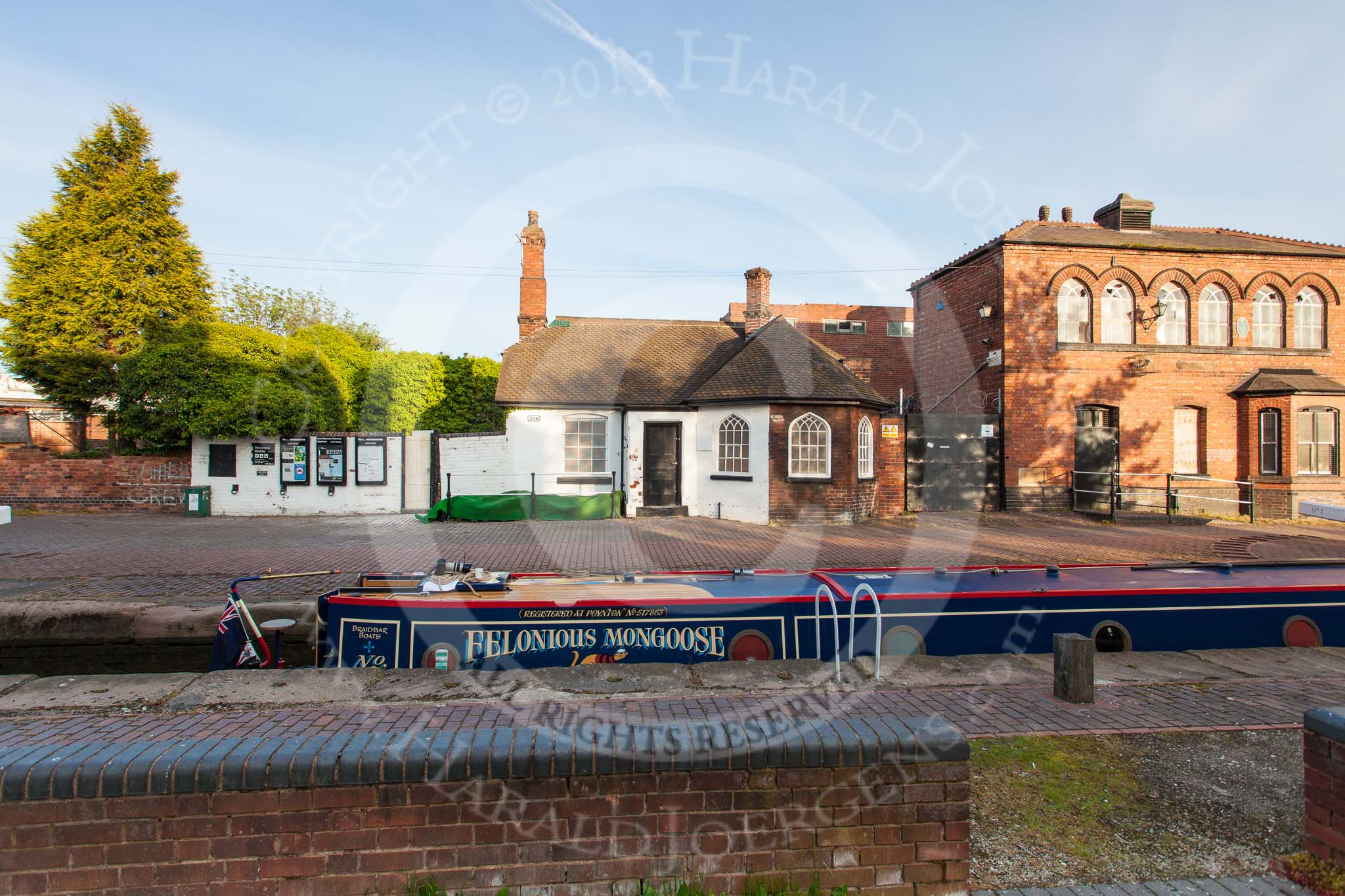 BCN Marathon Challenge 2013: NB "Felonious Mongoose" rising in Walsall Top Lock. On the side of the lock the white toll office (BCN house number 206) and the Boatman's Rest, one of three mission halls on the BCN, next to it.. Birmingham Canal Navigation, United Kingdom, on 26 May 2013 at 06:14, image #350