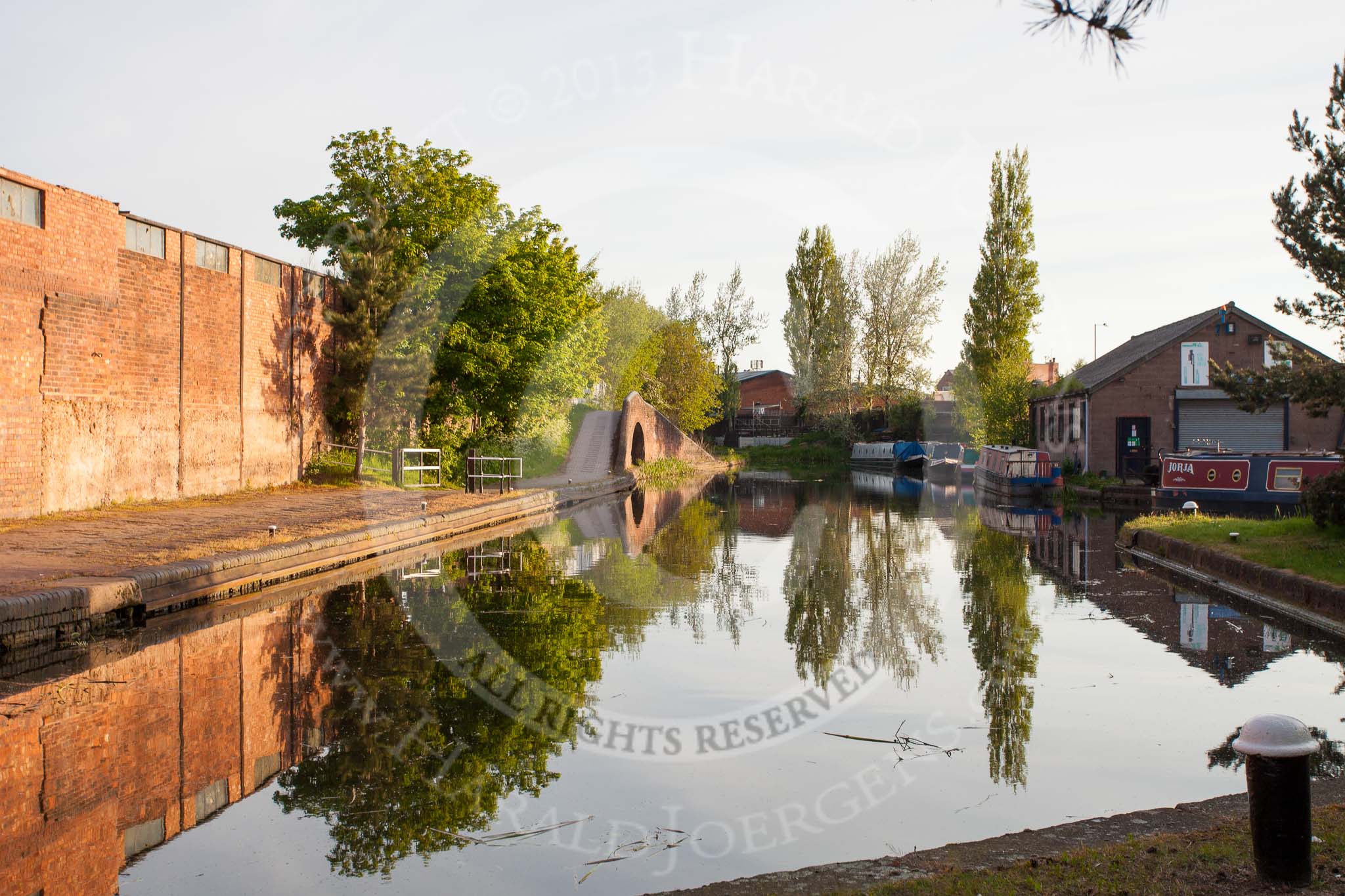BCN Marathon Challenge 2013: The Walsall Branch Canal next to Walsall Top Lock. On the left a fectory bridge that once served Birchills Iron Foundry, on the right Birchills Wharf, a former railway interchange basin that served local iron works.. Birmingham Canal Navigation, United Kingdom, on 26 May 2013 at 06:14, image #351