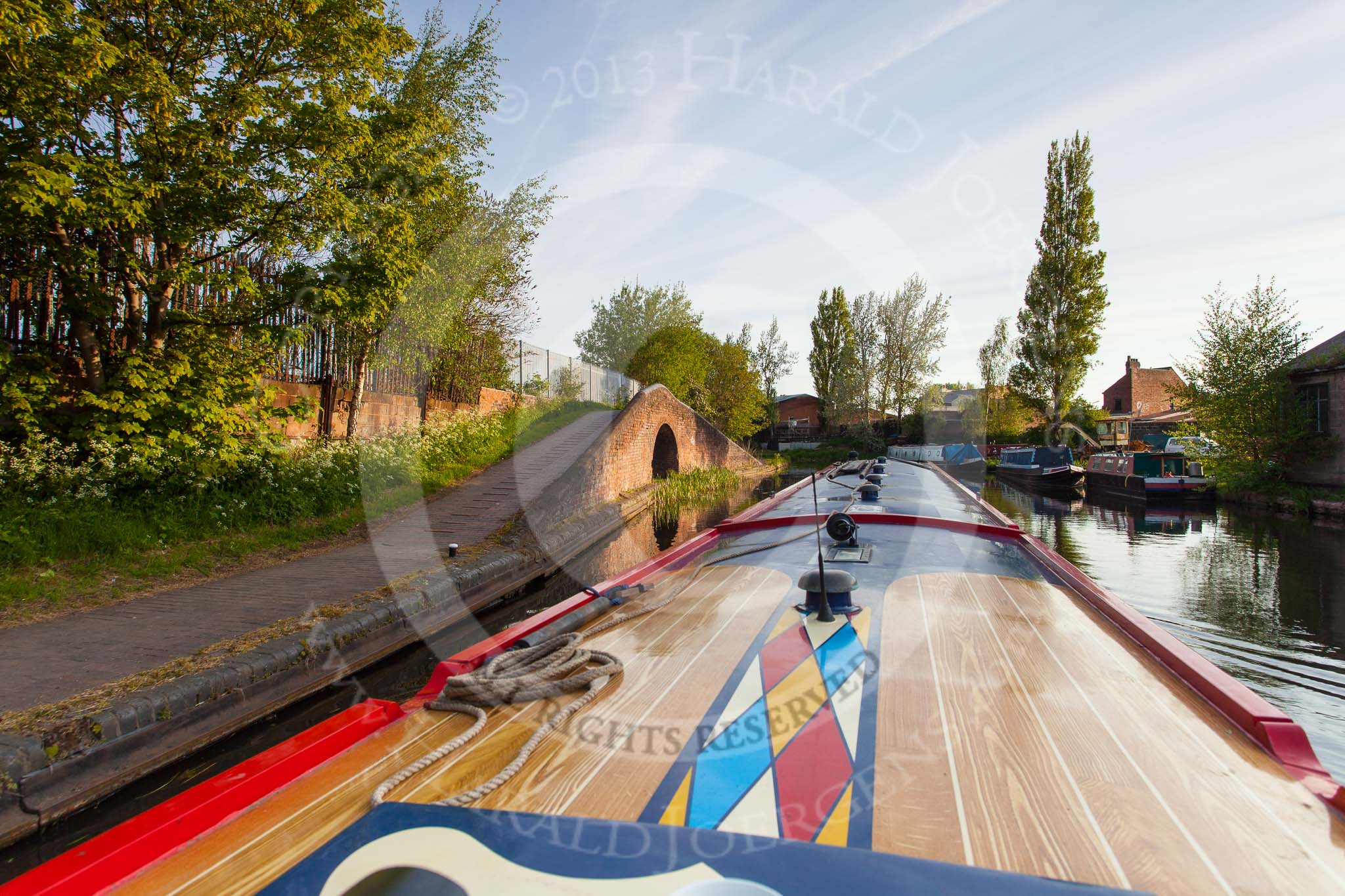 BCN Marathon Challenge 2013: NB "Felonious Mongoose" near Walsall Top Lock on the Walsall Branch Canal, heading for the Wyrley & Essington Canal. The factory bridge on the lefy once served Birchills Iron Foundry.. Birmingham Canal Navigation, United Kingdom, on 26 May 2013 at 06:18, image #353