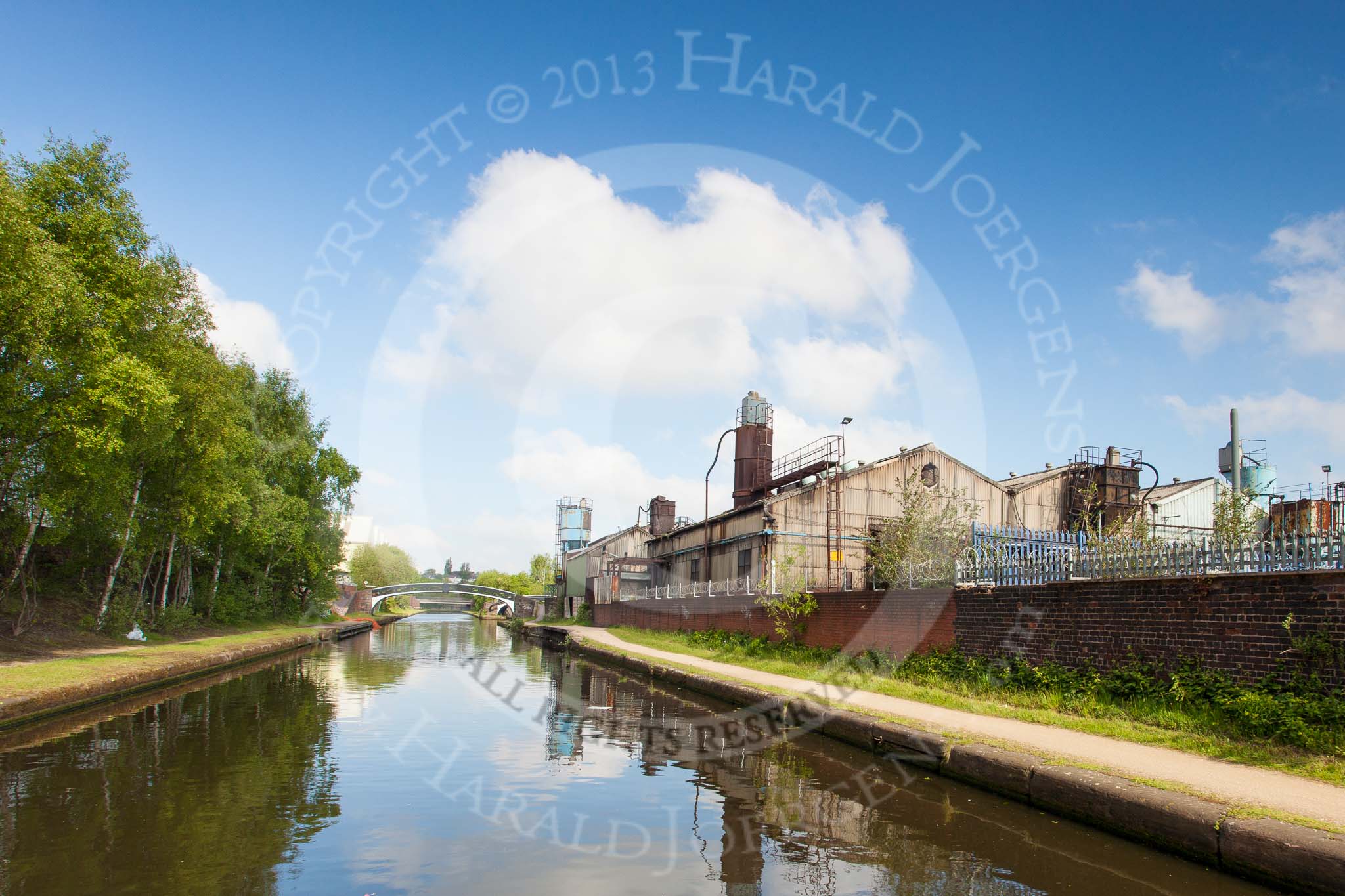 BCN Marathon Challenge 2013: The BCN New Main Line between Rabone Lane Bridge (behind) and Smethwick Main Line Turnover Bridge. Just before the bridge, on the right and next to the factory, the bump in the towpath is at the site of a former canal branch.. Birmingham Canal Navigation, United Kingdom, on 25 May 2013 at 08:52, image #85
