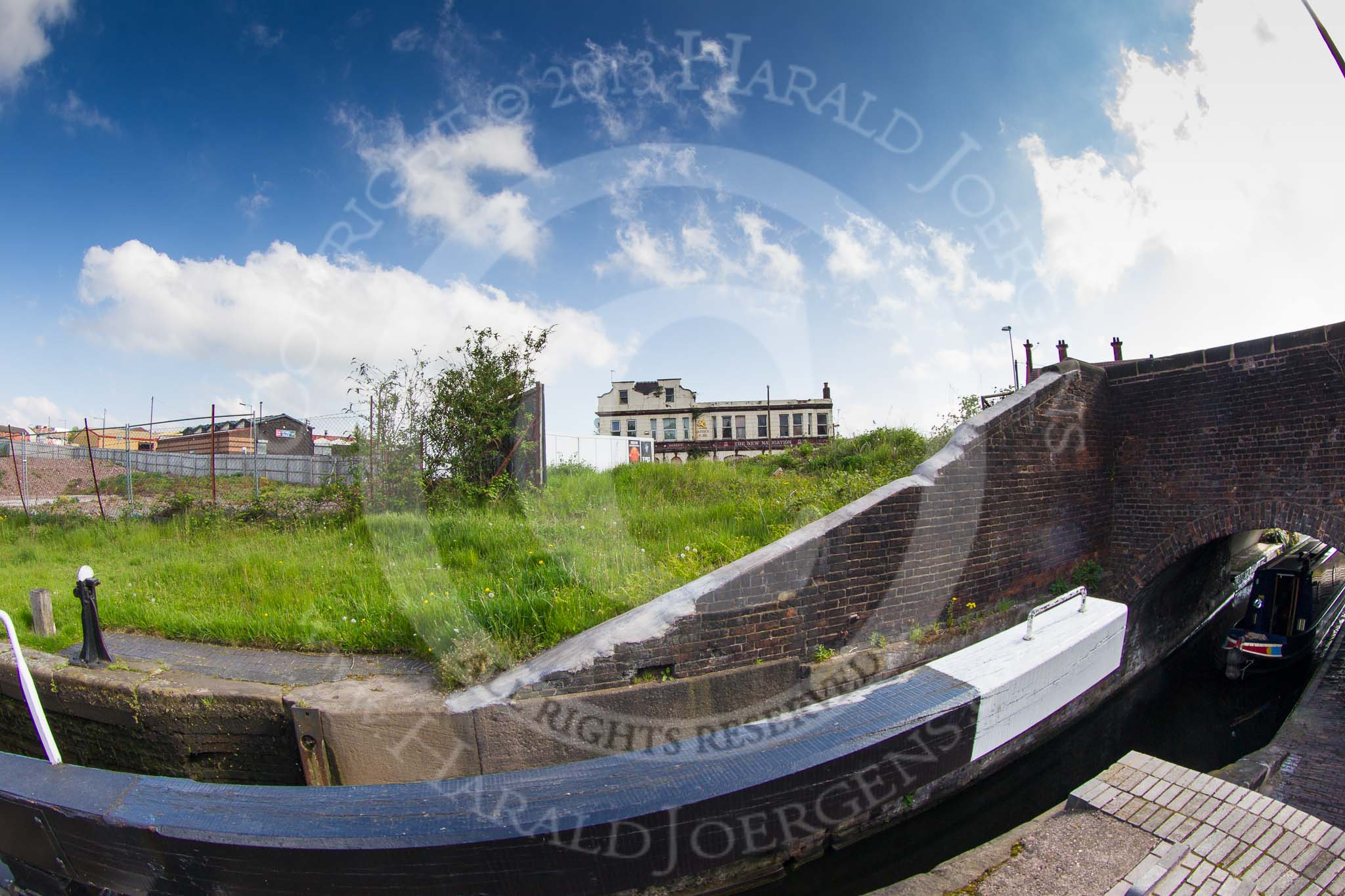 BCN Marathon Challenge 2013: Smethwick bottom lock on the BCN Old Main Line, close to Smethwick Junction. The "New Navigation Inn", a Banks's pub, has seen better times. There used to be two parallel sets of locks, built by John Smeaton in 1786 to cope with the amount of traffic, the duplicate locks were removed in the 1960s.. Birmingham Canal Navigation, United Kingdom, on 25 May 2013 at 09:02, image #90