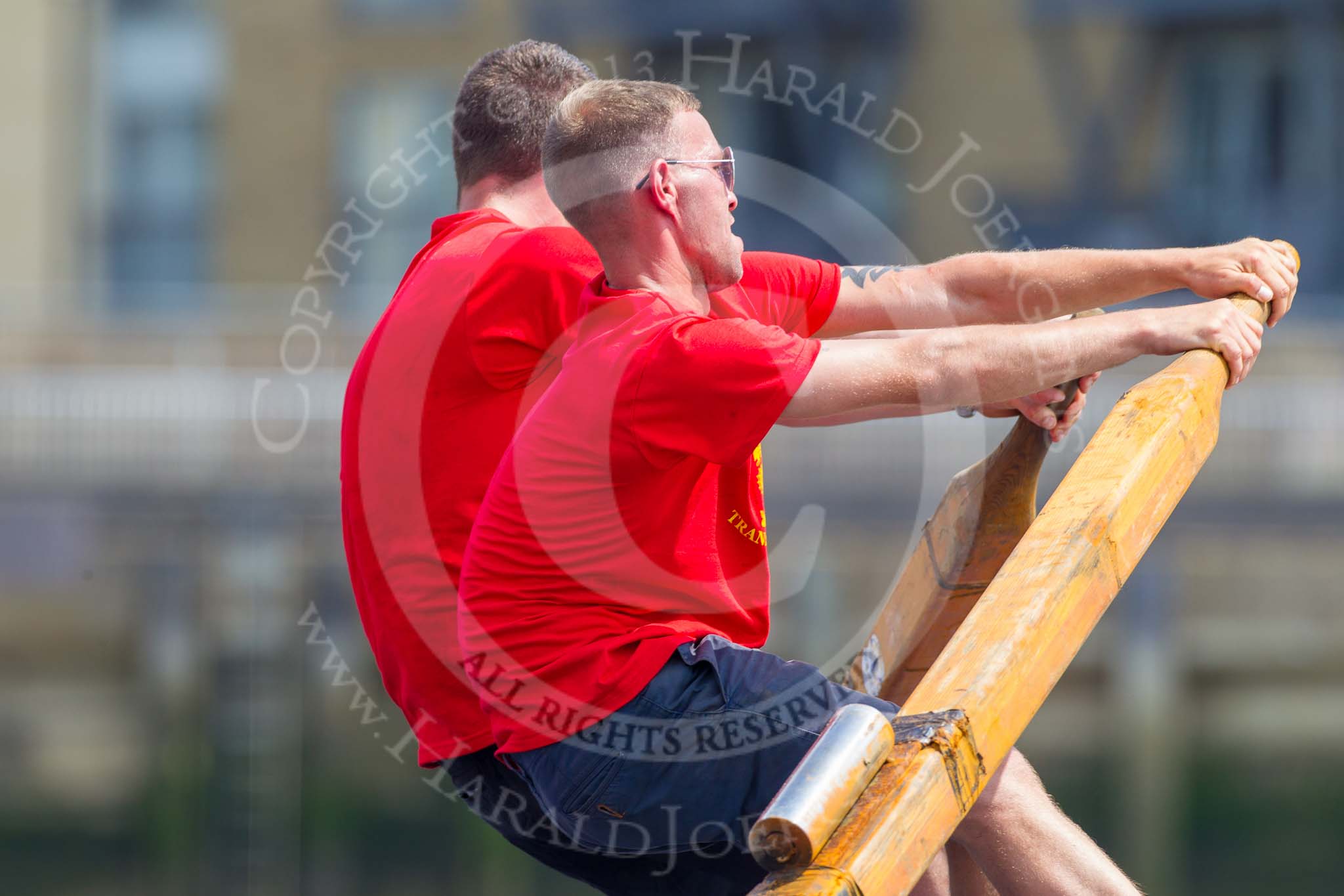 TOW River Thames Barge Driving Race 2013: Rowers on barge "Diana", by Trinity Buoy Wharf.. River Thames between Greenwich and Westminster, London, United Kingdom, on 13 July 2013 at 13:09, image #282
