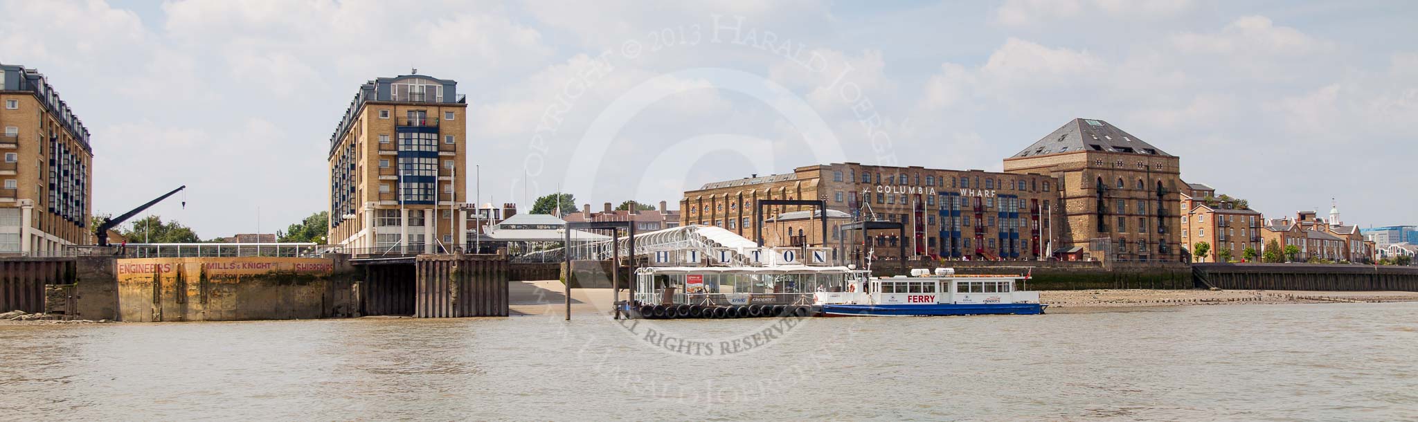 TOW River Thames Barge Driving Race 2013: Columbia Wharf and Hilton Docklands Riverside, London SE16, seen from the river.. River Thames between Greenwich and Westminster, London, United Kingdom, on 13 July 2013 at 13:11, image #284