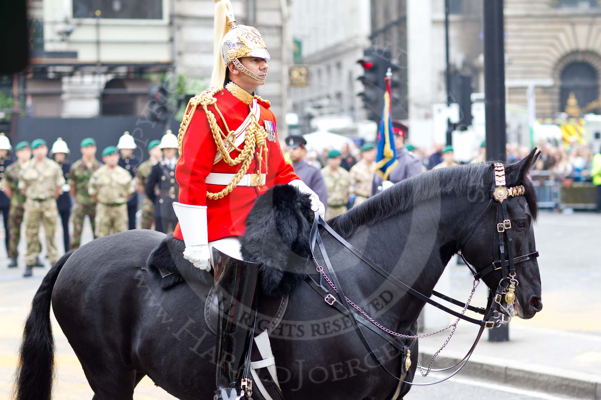 The Lord Mayor's Show 2011: Close-up of a Trooper from The Blues and Royals, Mounted Squadron, Household Regiment, the escort to the new Lord mayor.. Opposite Mansion House, City of London, London, -, United Kingdom, on 12 November 2011 at 10:50, image #30