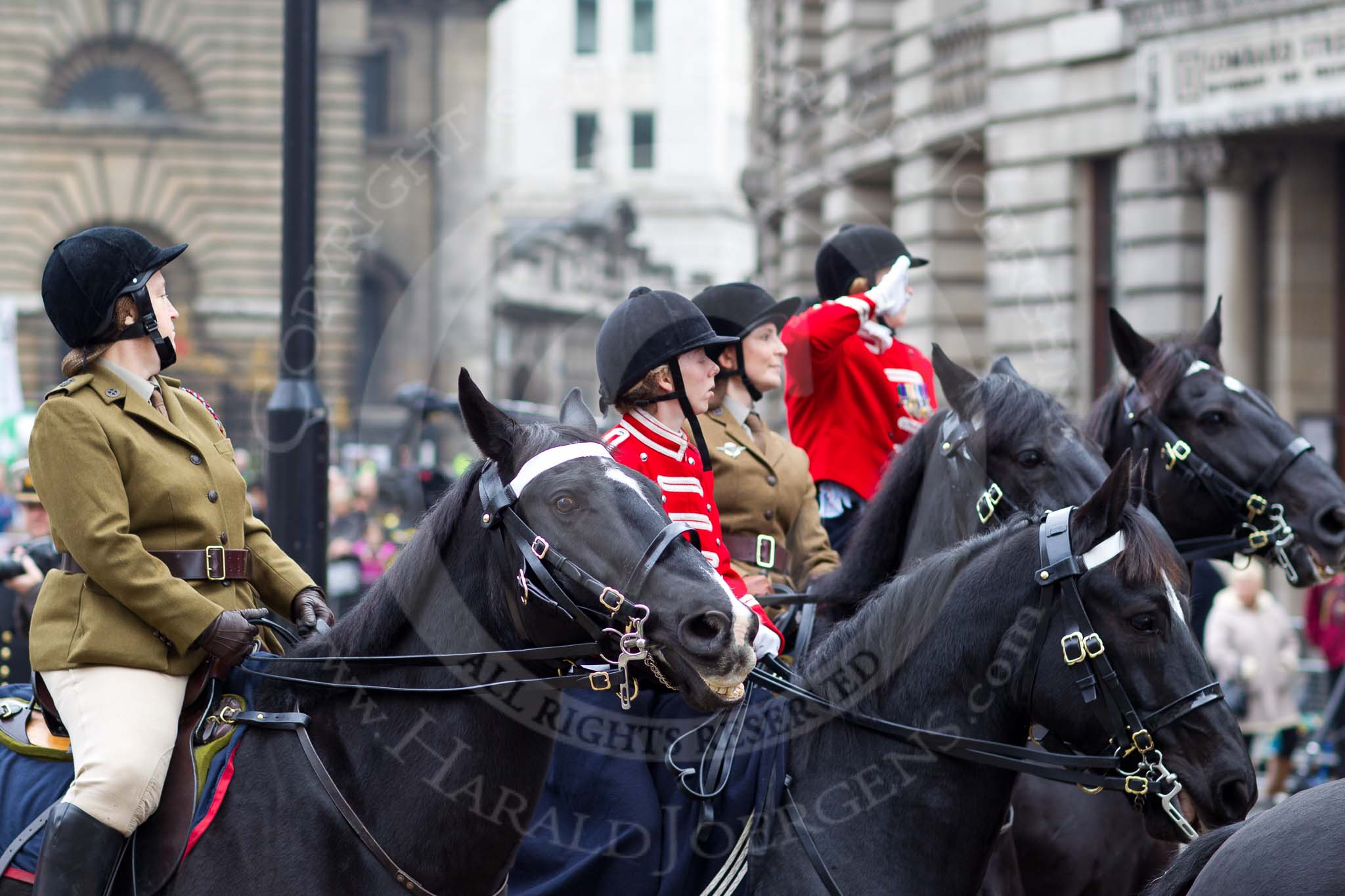 The Lord Mayor's Show 2011: FANY (Princess Royal's Volunteer Corps, http://www.fany.org.uk/): The ladies in front and in the middle are dressed in original 1907 uniforms, the two others in the current service dress. The FANY giving the salute in the background is the Commanding Officer, Commandant Kim McCutcheon .. Opposite Mansion House, City of London, London, -, United Kingdom, on 12 November 2011 at 11:39, image #394