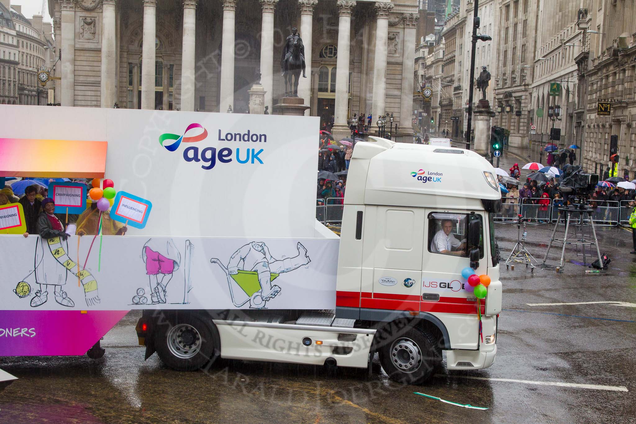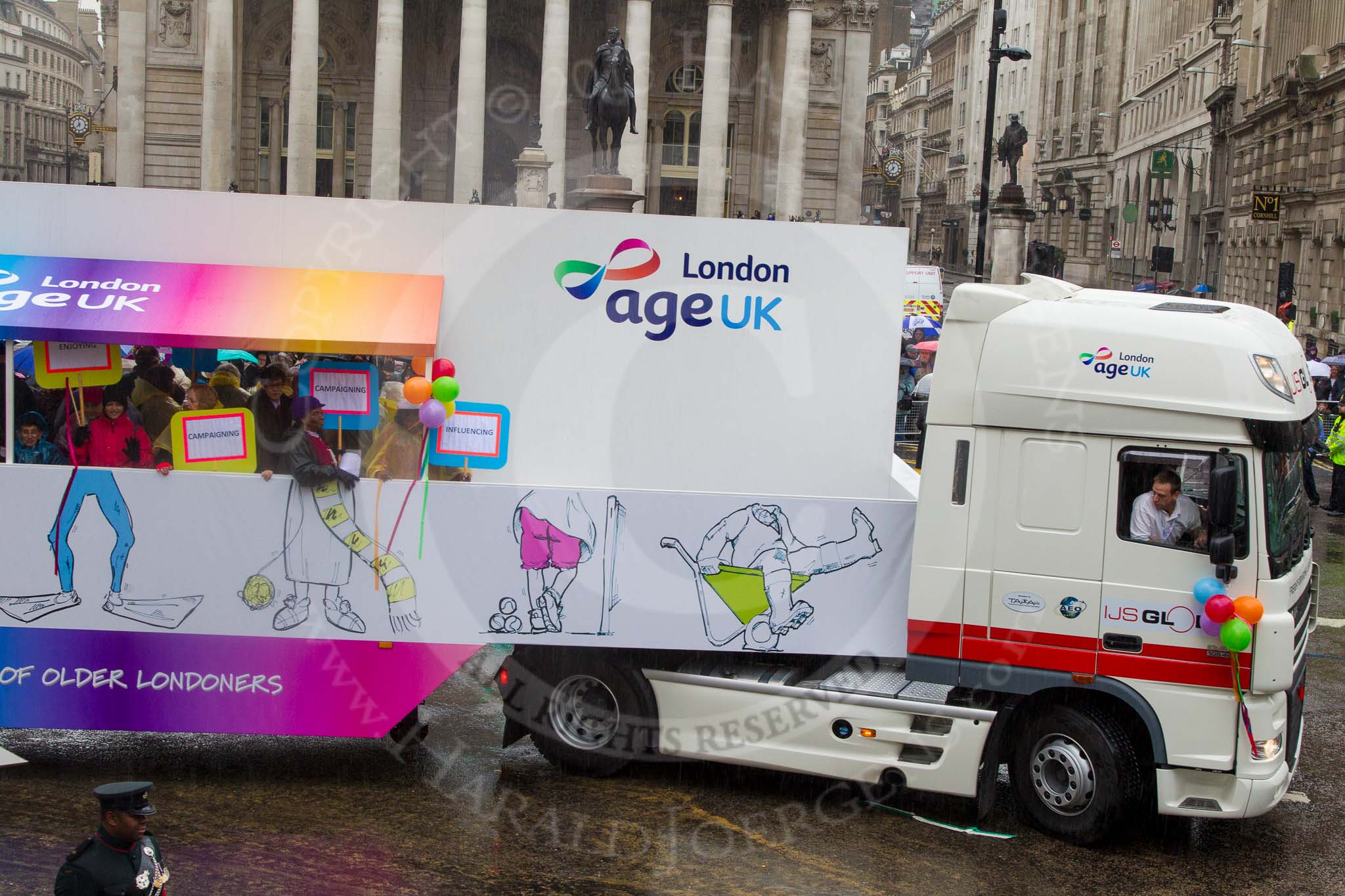Lord Mayor's Show 2013: 71- Age UK London-it works hard to support and enhance local projects and champion the voices of older people at regional level.. Press stand opposite Mansion House, City of London, London, Greater London, United Kingdom, on 09 November 2013 at 11:40, image #867