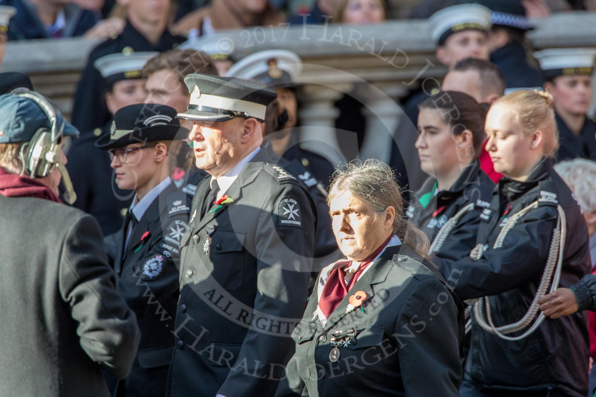 St John Ambulance (Group M12, 25 members) during the Royal British Legion March Past on Remembrance Sunday at the Cenotaph, Whitehall, Westminster, London, 11 November 2018, 12:26.