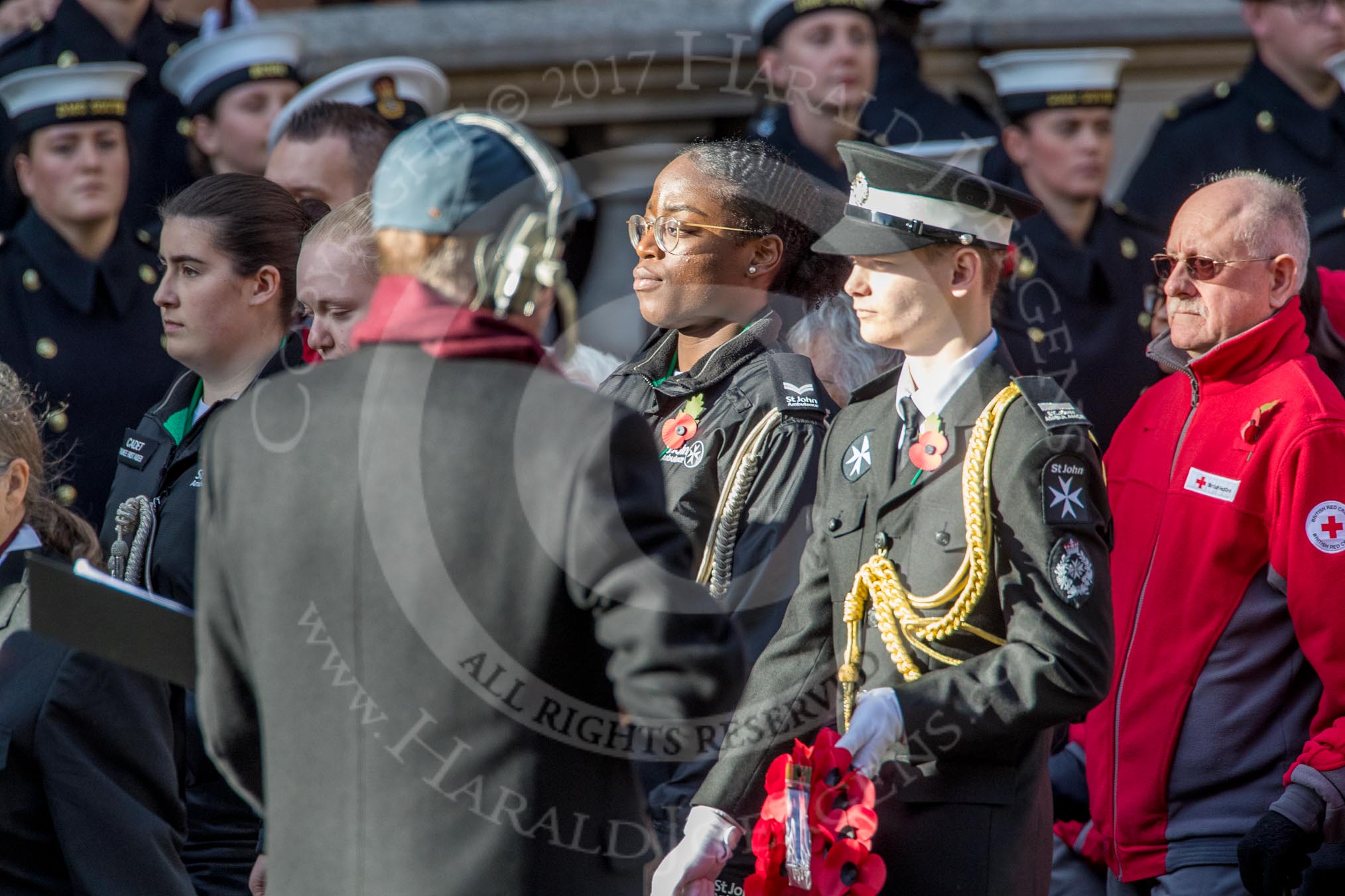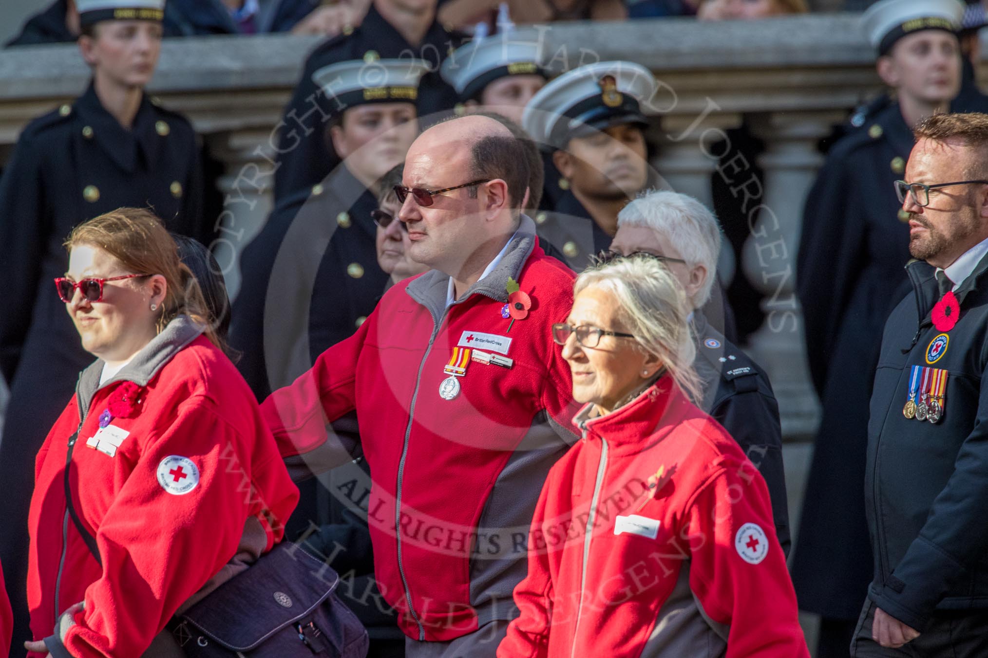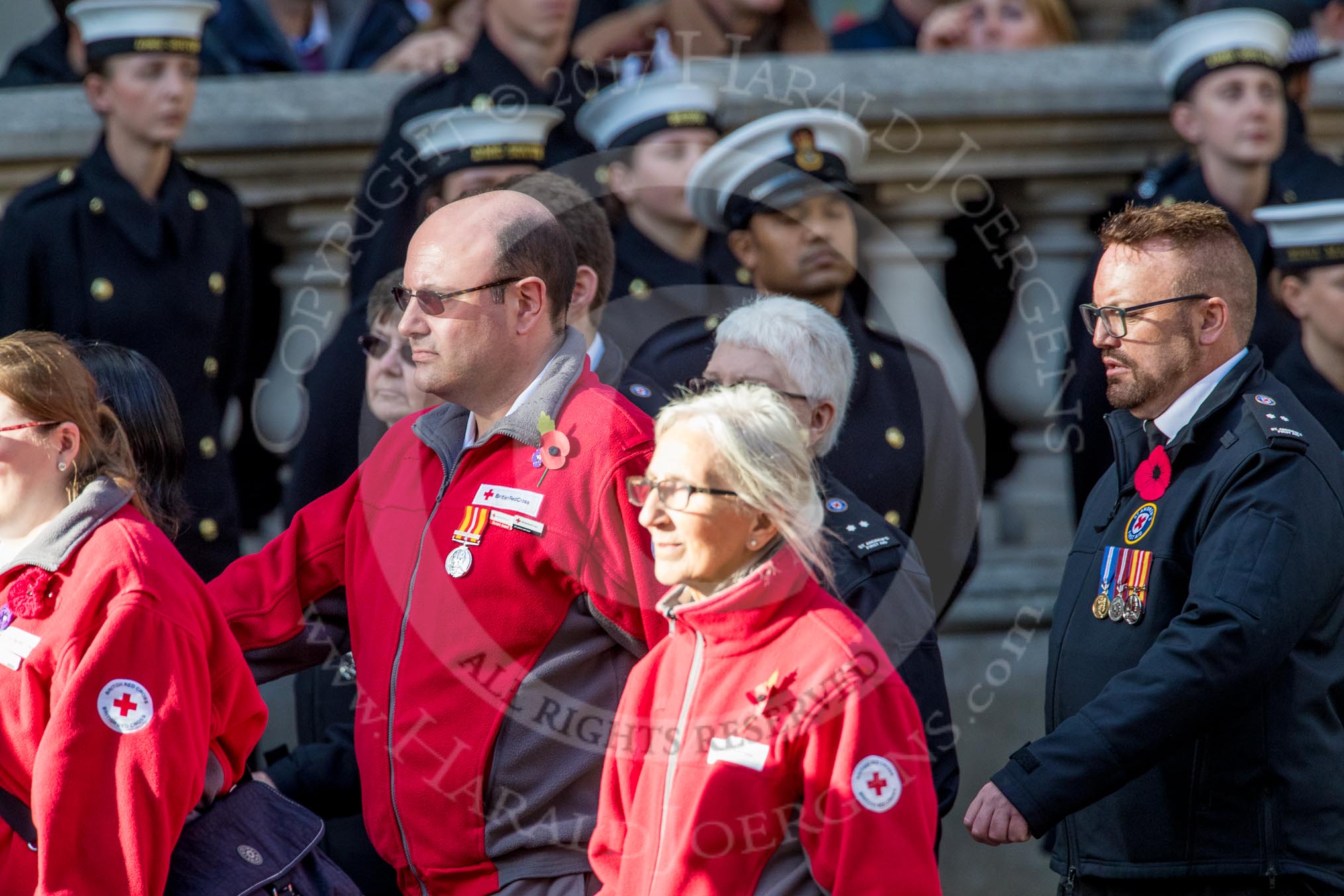 St John Ambulance (Group M12, 25 members) and British Red Cross (Group M13, 15 members) during the Royal British Legion March Past on Remembrance Sunday at the Cenotaph, Whitehall, Westminster, London, 11 November 2018, 12:26.during the Royal British Legion March Past on Remembrance Sunday at the Cenotaph, Whitehall, Westminster, London, 11 November 2018, 12:26.