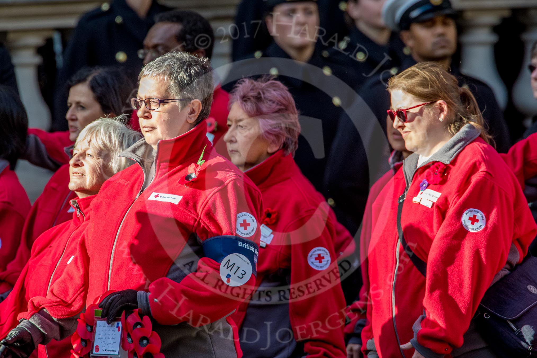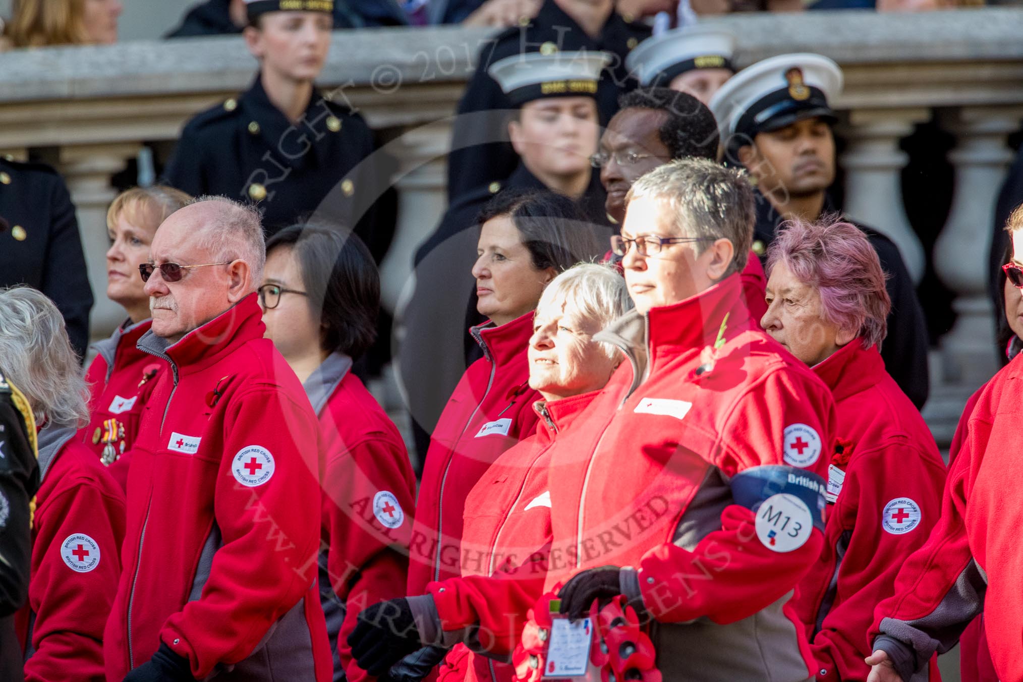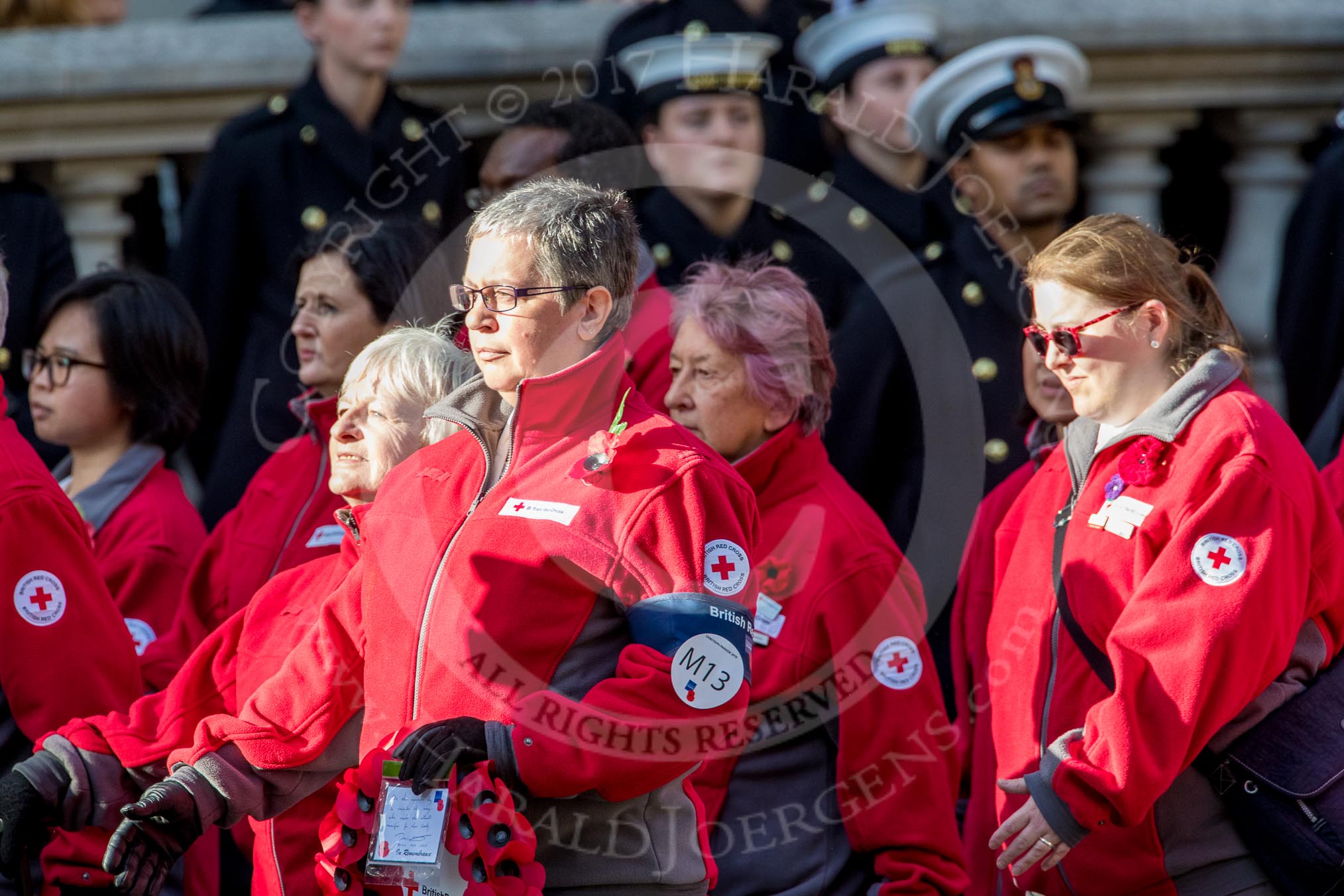 British Red Cross (Group M13, 15 members) during the Royal British Legion March Past on Remembrance Sunday at the Cenotaph, Whitehall, Westminster, London, 11 November 2018, 12:26.