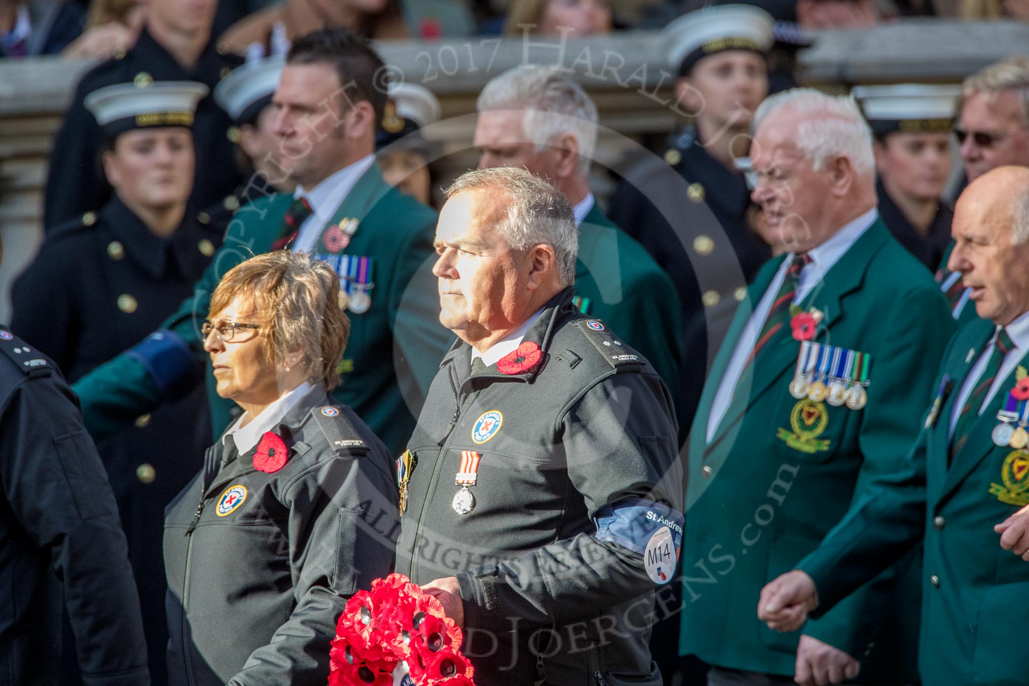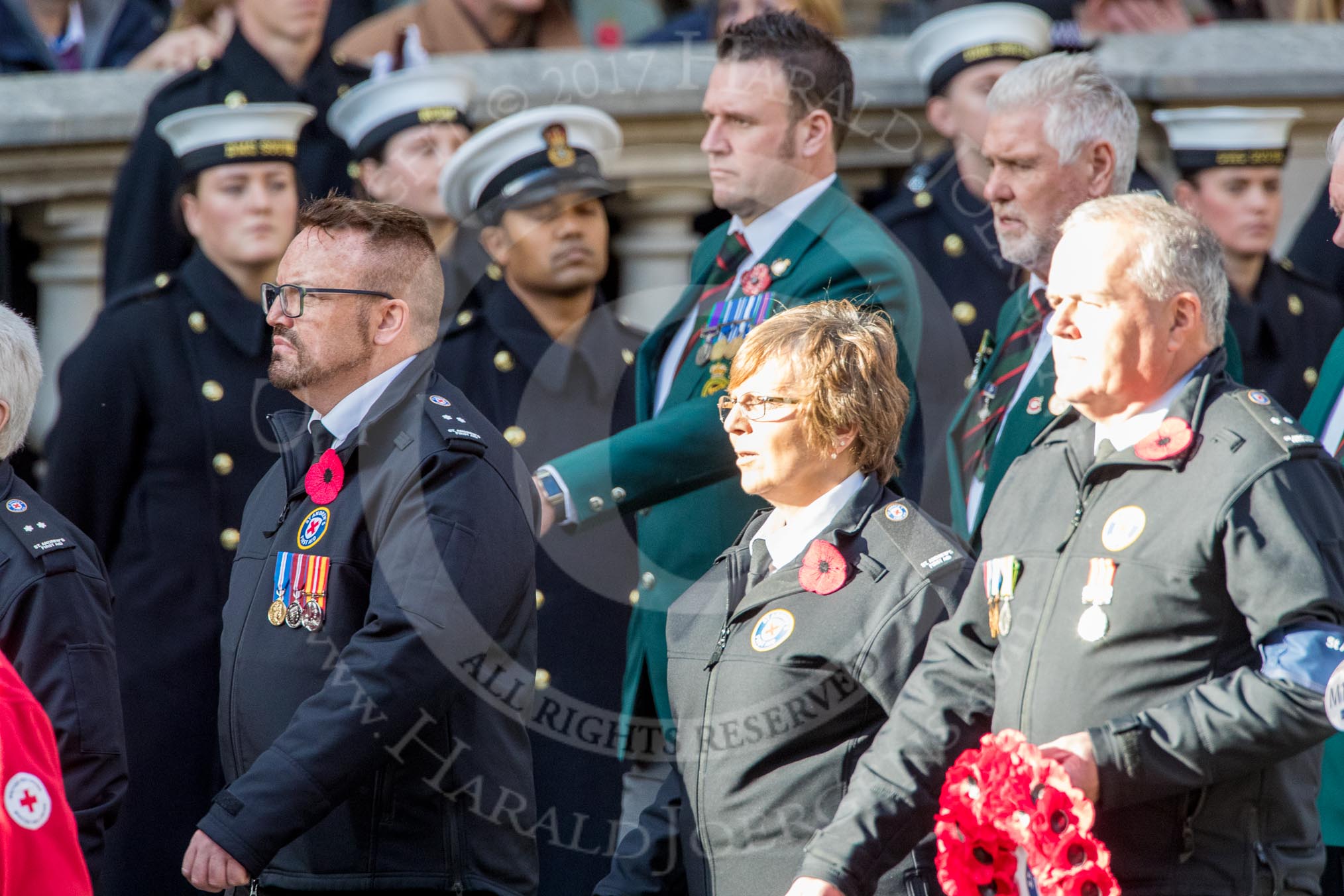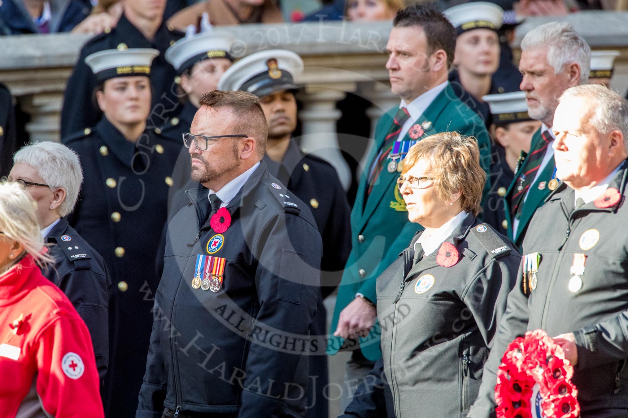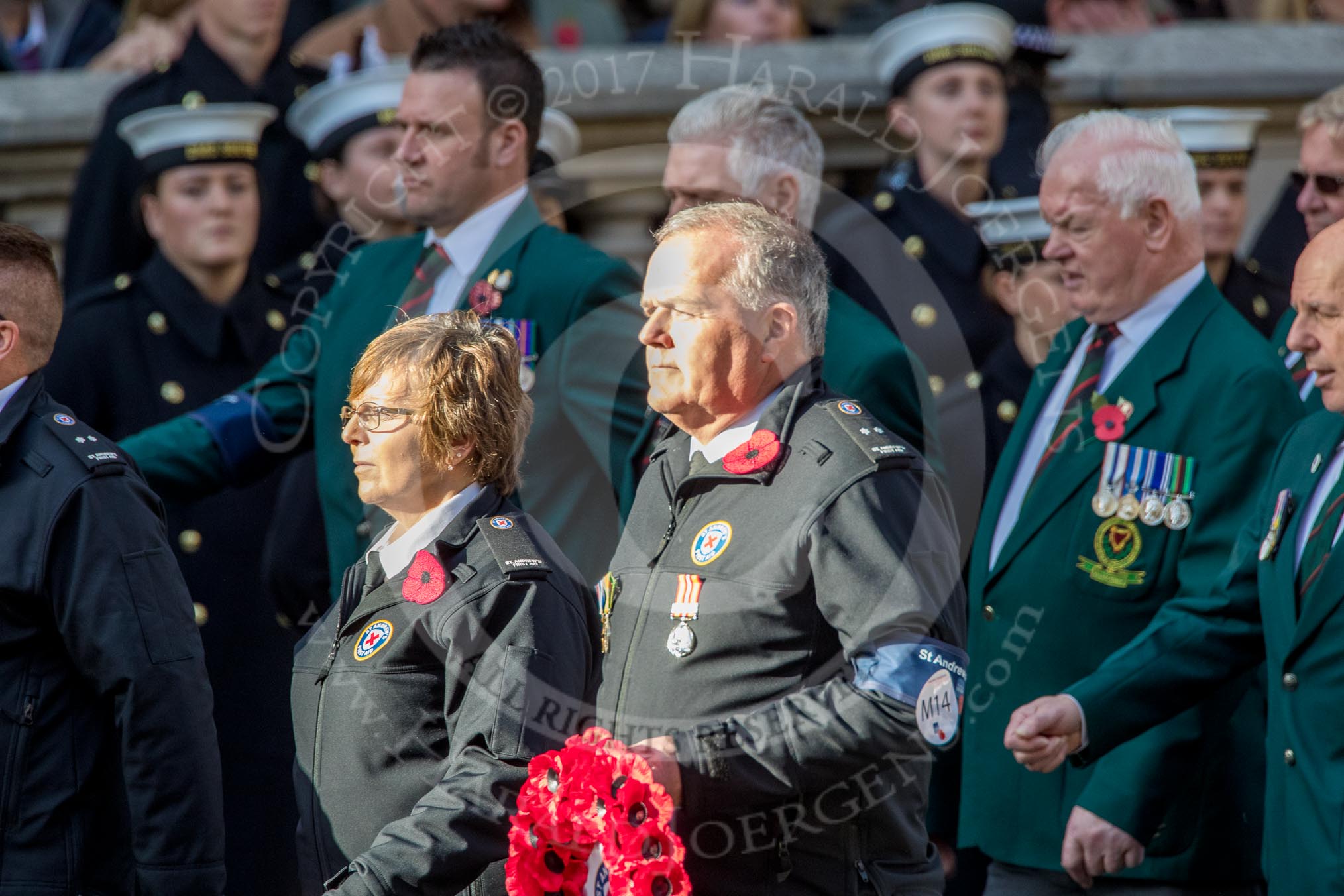 St Andrew's First Aid (Group M14, 6 members) during the Royal British Legion March Past on Remembrance Sunday at the Cenotaph, Whitehall, Westminster, London, 11 November 2018, 12:26.