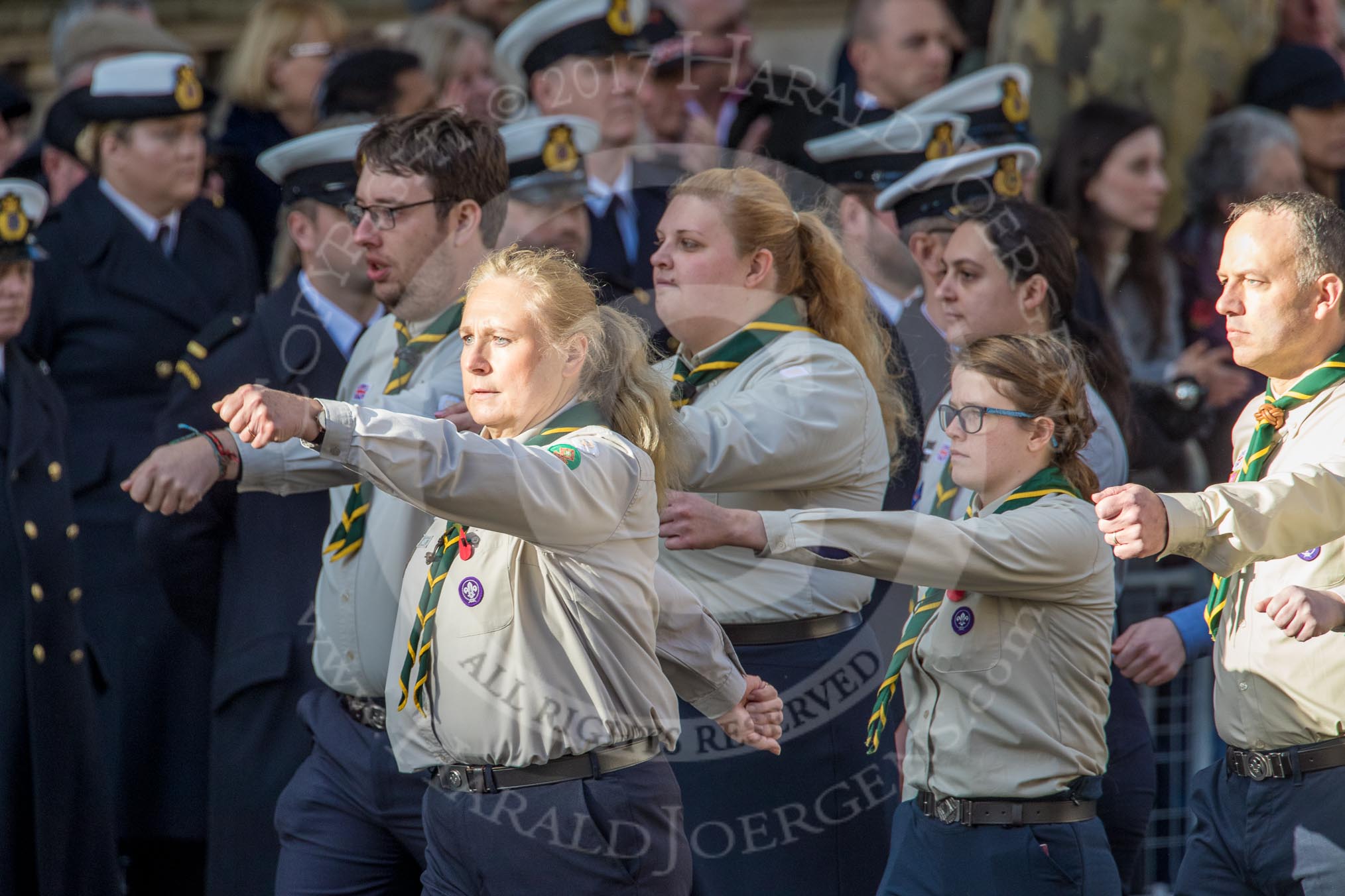 The Scout Association (Group M36, 30 members) during the Royal British Legion March Past on Remembrance Sunday at the Cenotaph, Whitehall, Westminster, London, 11 November 2018, 12:30.