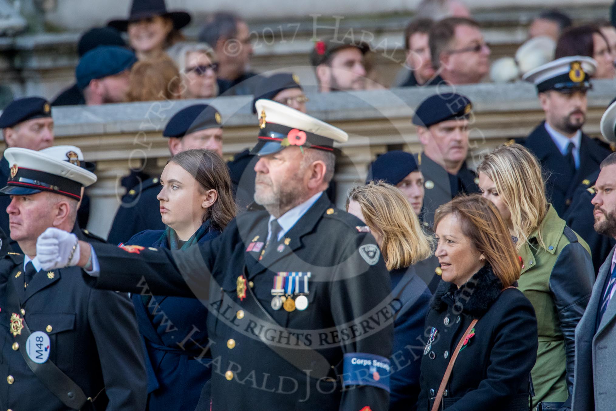 Corps Security (Group M48, 4 members) during the Royal British Legion March Past on Remembrance Sunday at the Cenotaph, Whitehall, Westminster, London, 11 November 2018, 12:31.