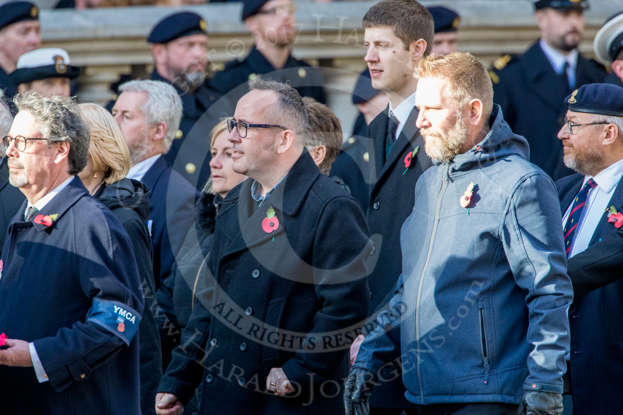 Corps Security (Group M48, 4 members) and YMCA (Group M49, 30 members) during the Royal British Legion March Past on Remembrance Sunday at the Cenotaph, Whitehall, Westminster, London, 11 November 2018, 12:31.