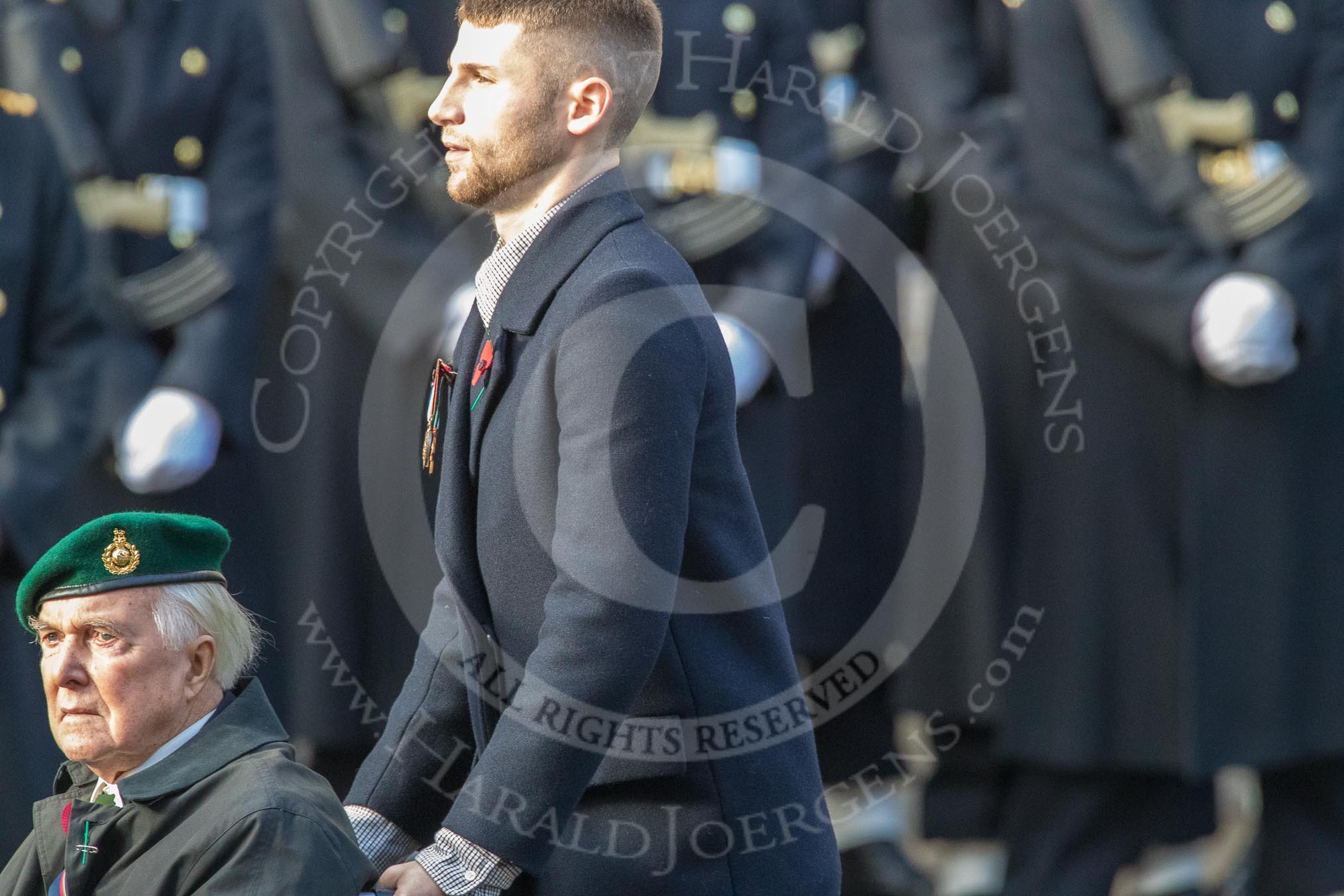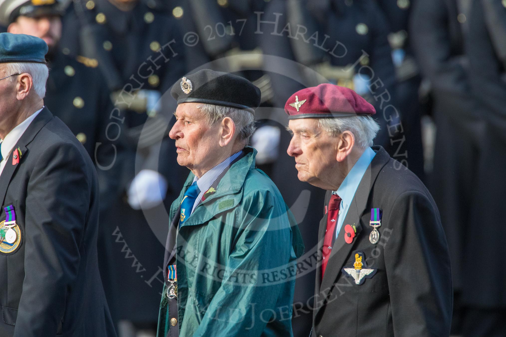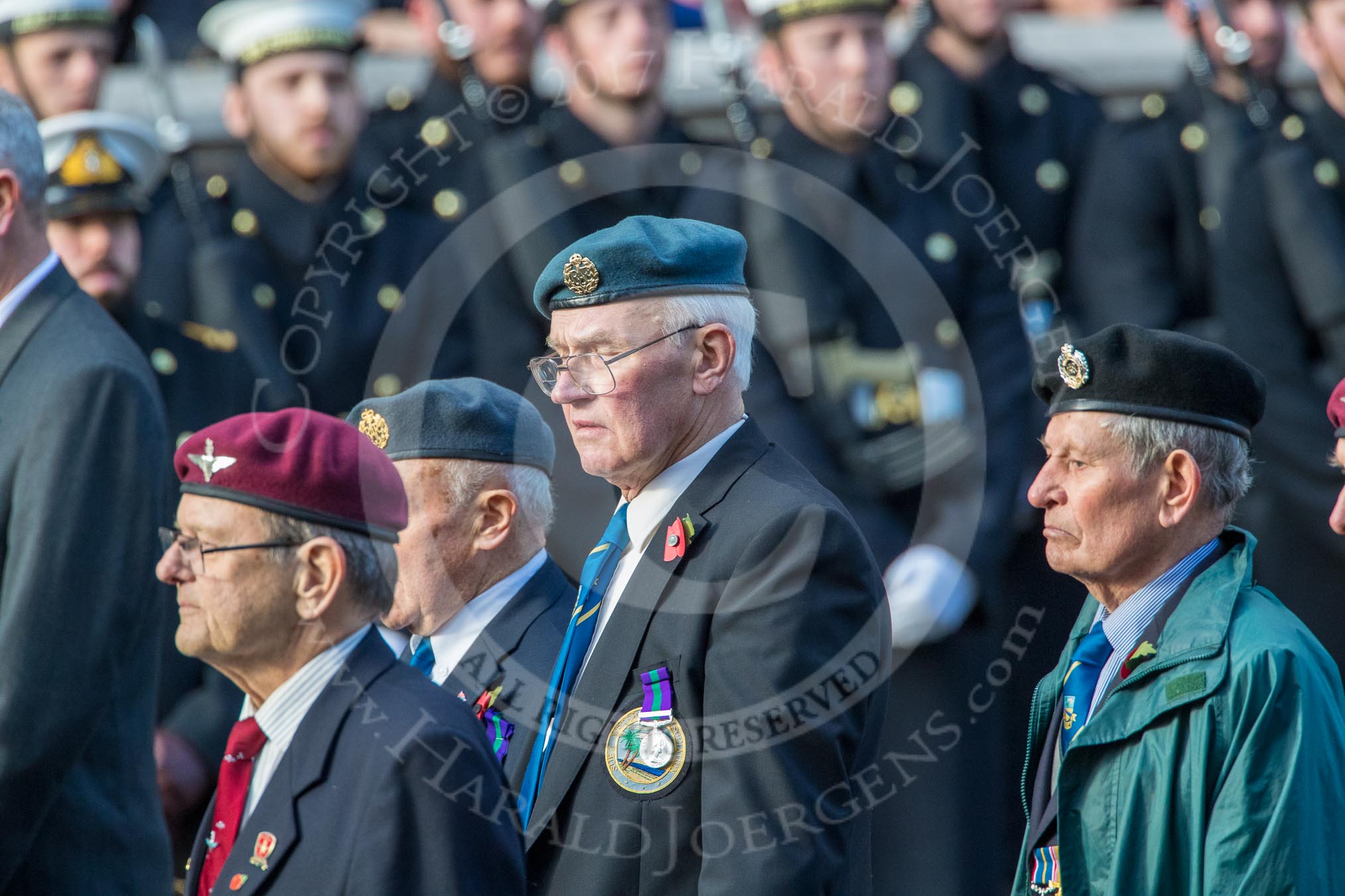 Aden Veterans Association (Group F16, 53 members) during the Royal British Legion March Past on Remembrance Sunday at the Cenotaph, Whitehall, Westminster, London, 11 November 2018, 11:52.