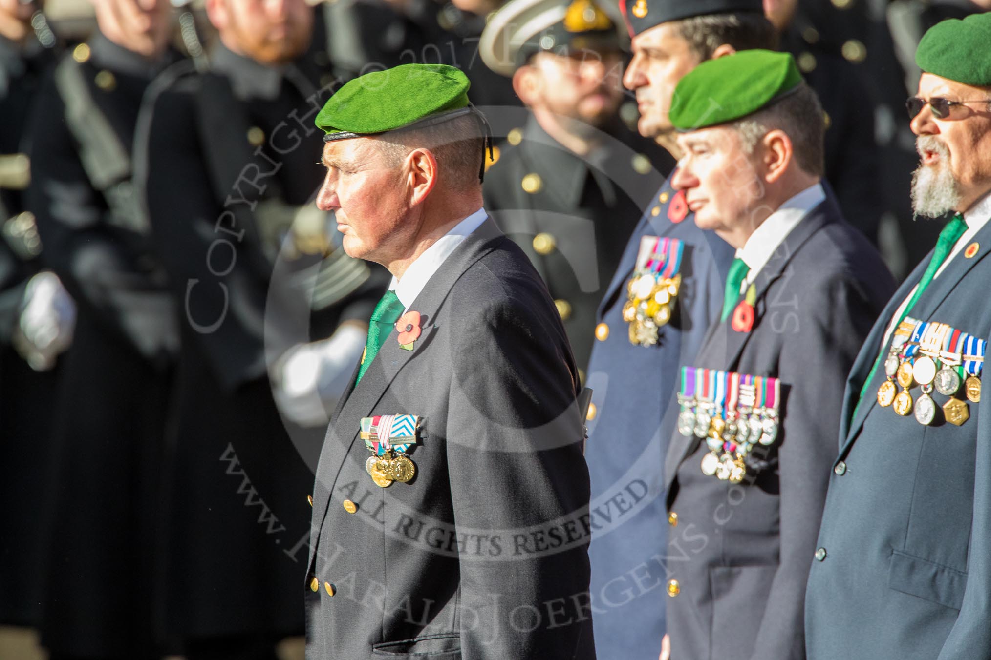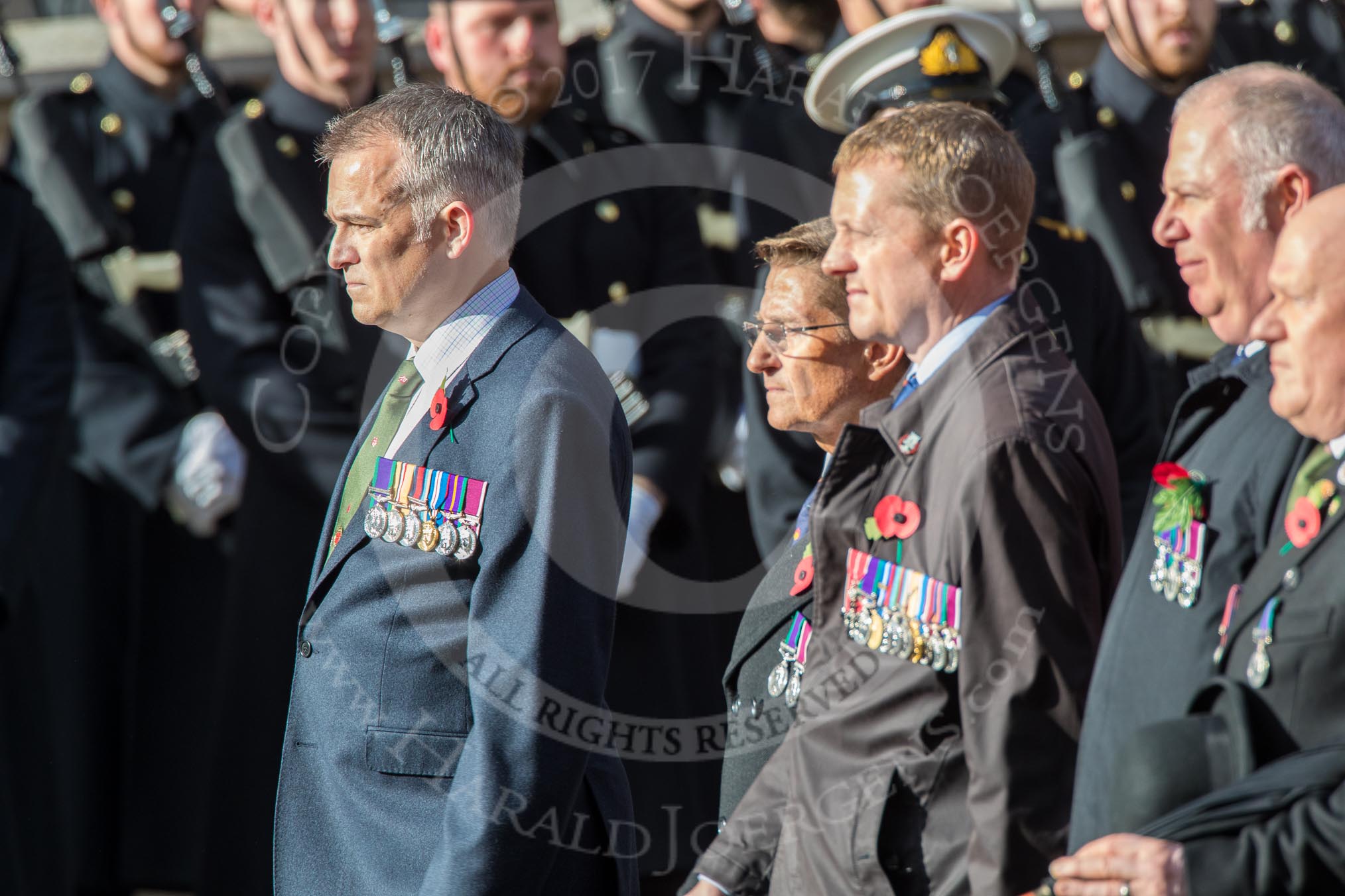 The Cheshire and North Wales Volunteer Decoration and Long Service Medallist’s Association (Group F29, 24 members) during the Royal British Legion March Past on Remembrance Sunday at the Cenotaph, Whitehall, Westminster, London, 11 November 2018, 11:54.