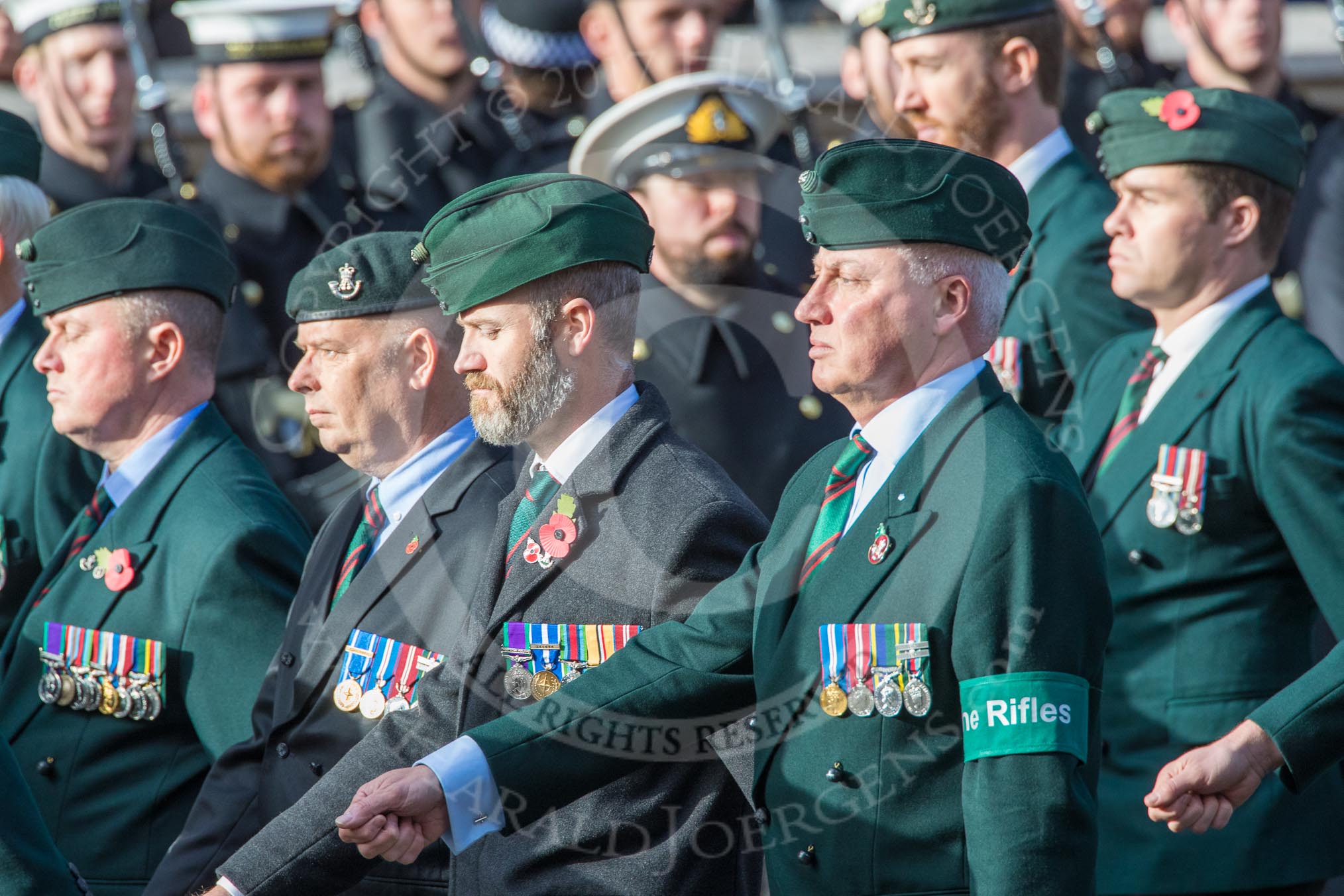 The Rifles Regimental Association (Group A3, 21 members) during the Royal British Legion March Past on Remembrance Sunday at the Cenotaph, Whitehall, Westminster, London, 11 November 2018, 11:56.