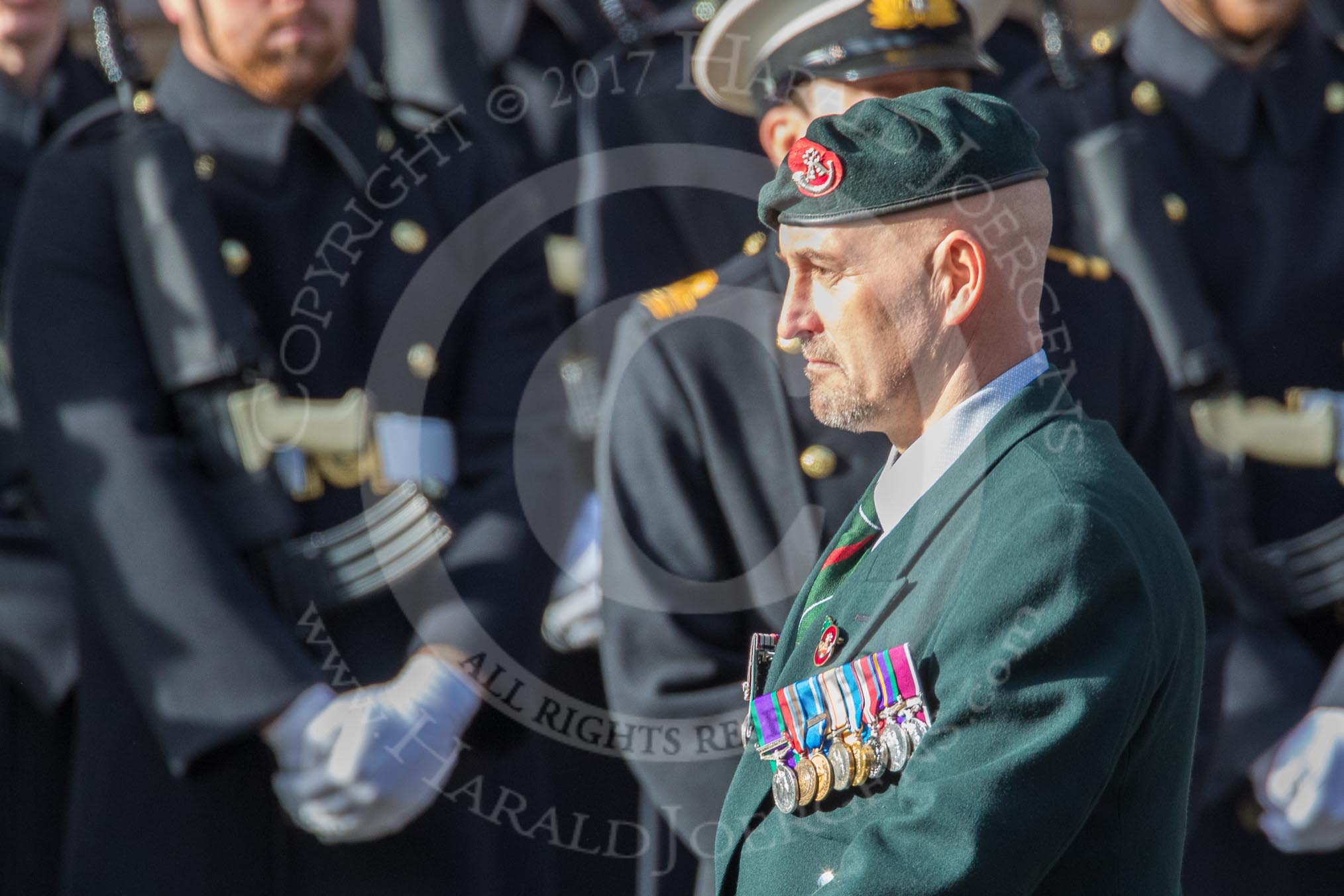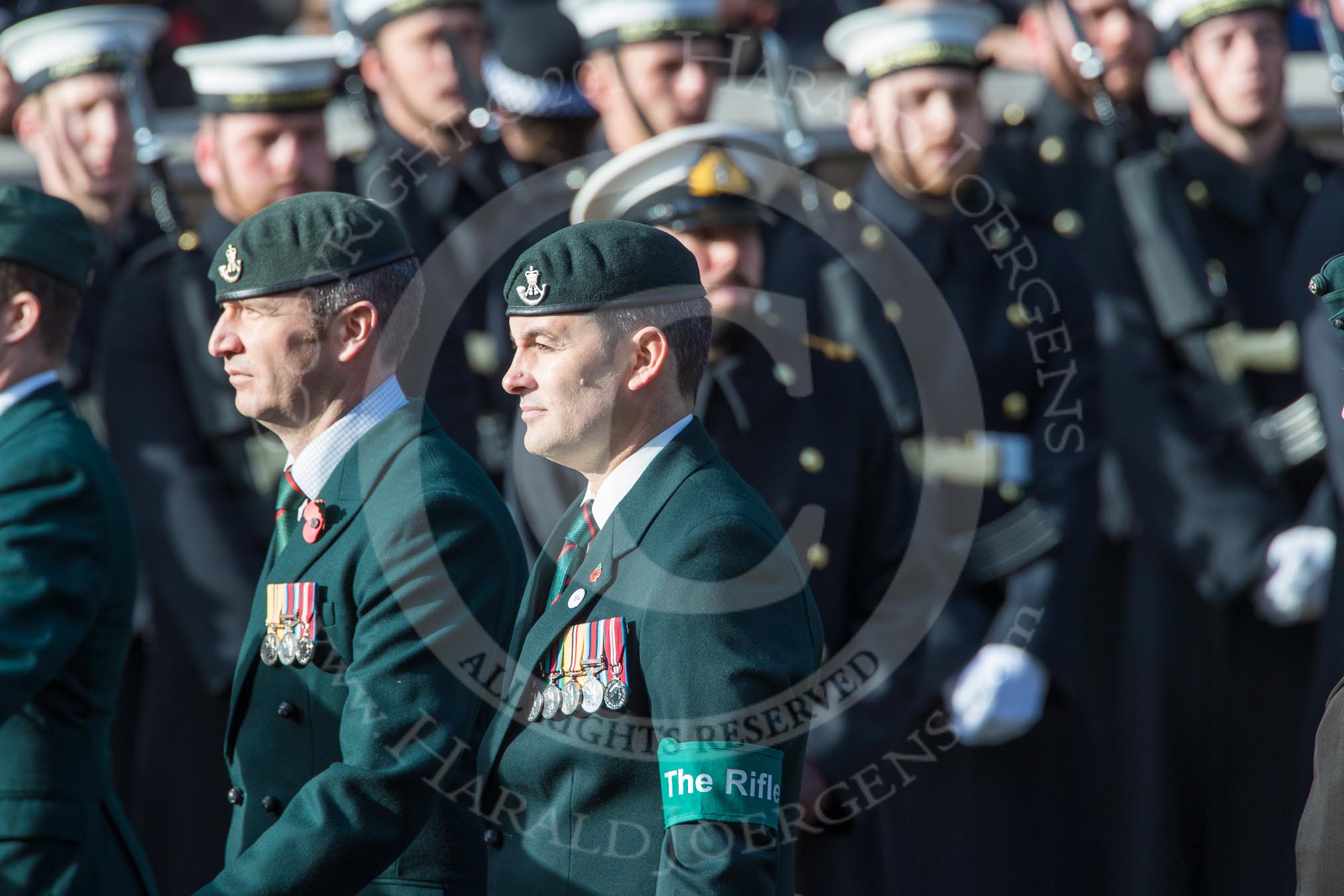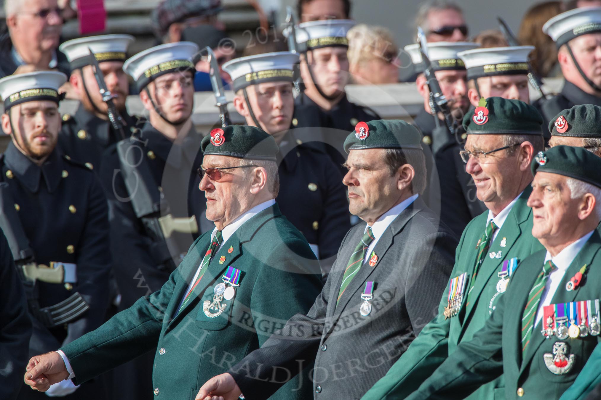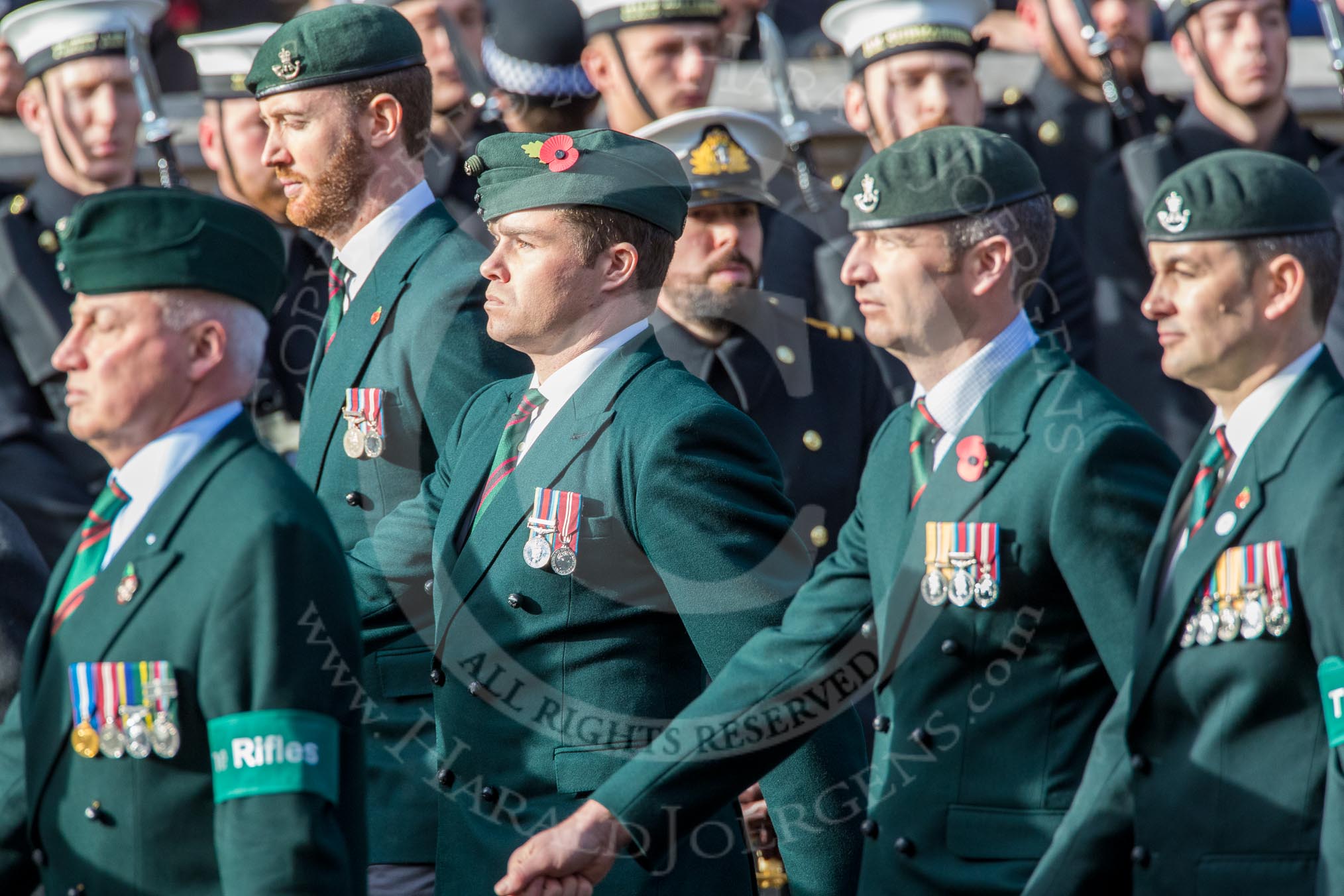 Royal Green Jackets (Group A2, 153 members) during the Royal British Legion March Past on Remembrance Sunday at the Cenotaph, Whitehall, Westminster, London, 11 November 2018, 11:55.