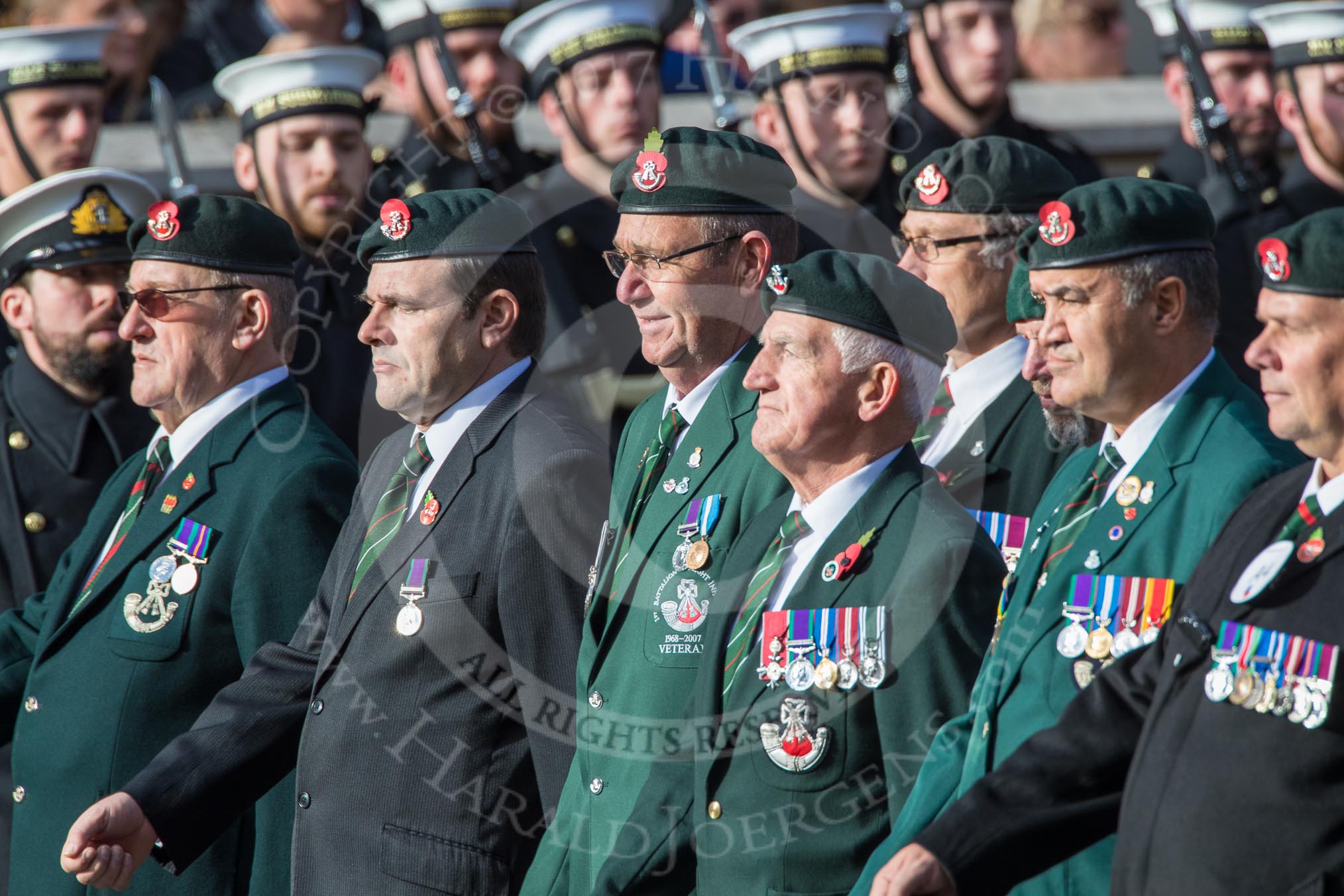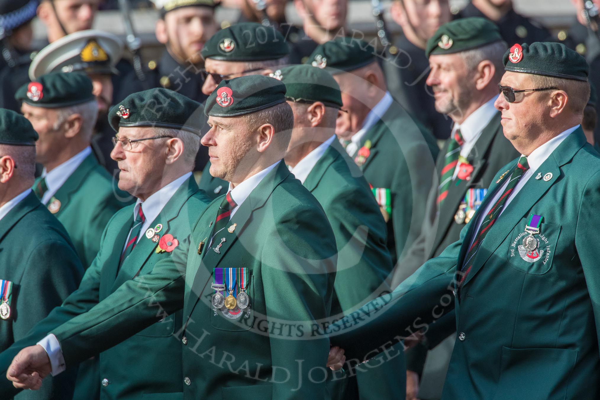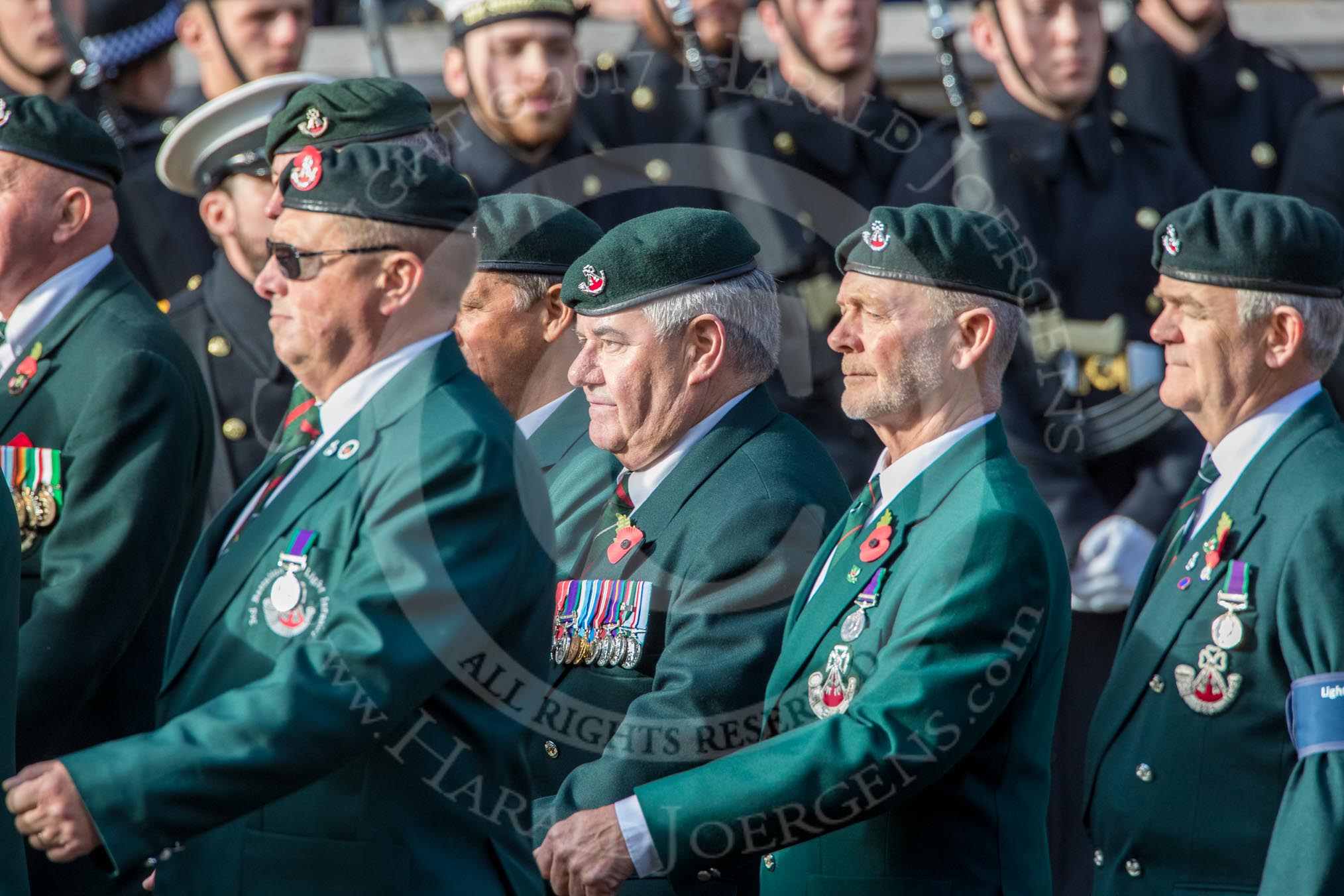 The Light Infantry Association (Group A4, 26 members) during the Royal British Legion March Past on Remembrance Sunday at the Cenotaph, Whitehall, Westminster, London, 11 November 2018, 11:56.