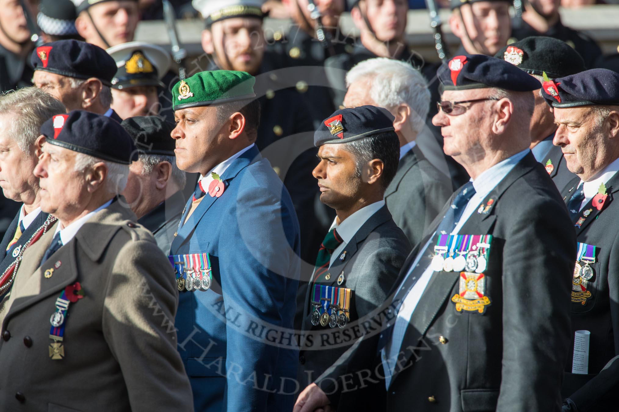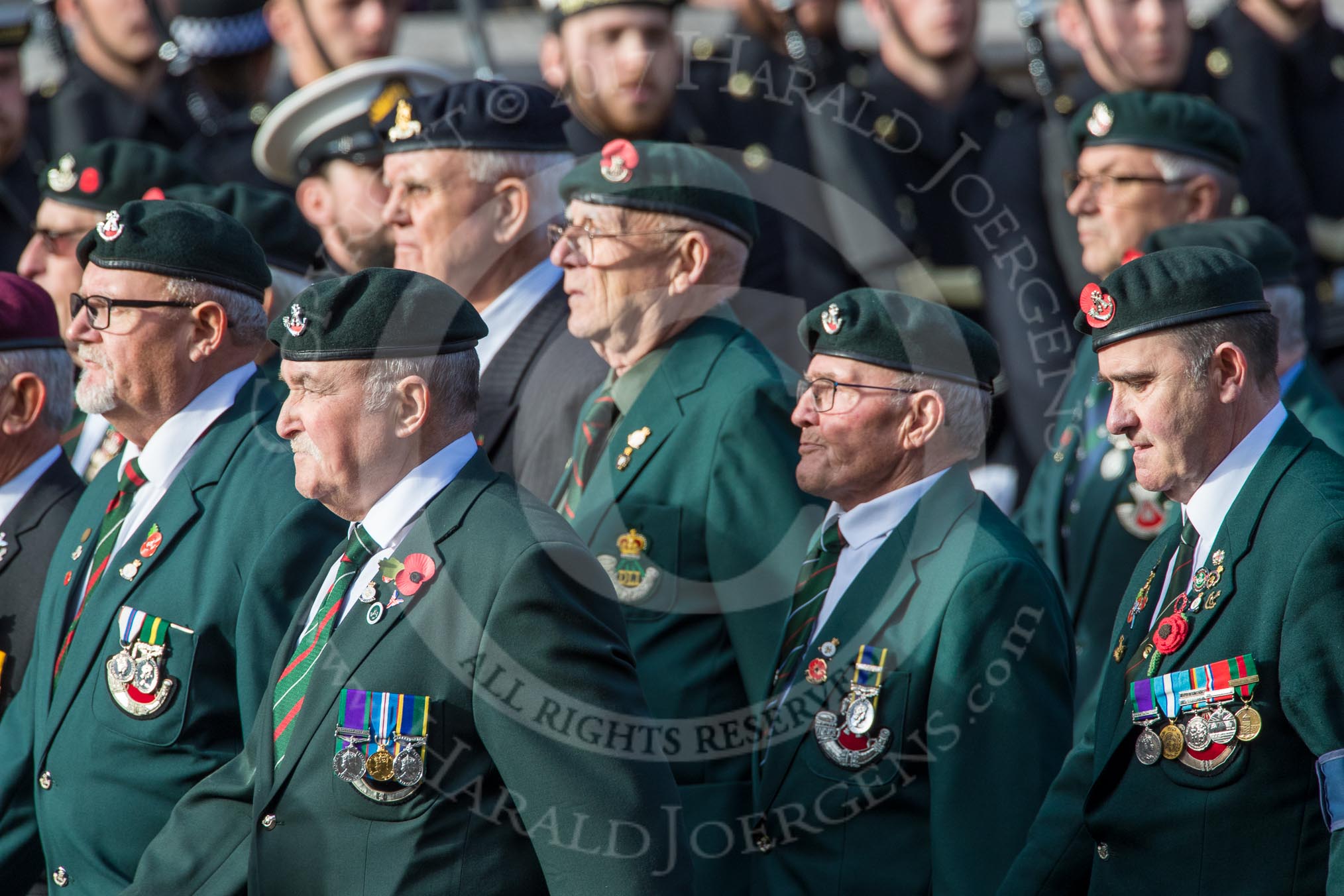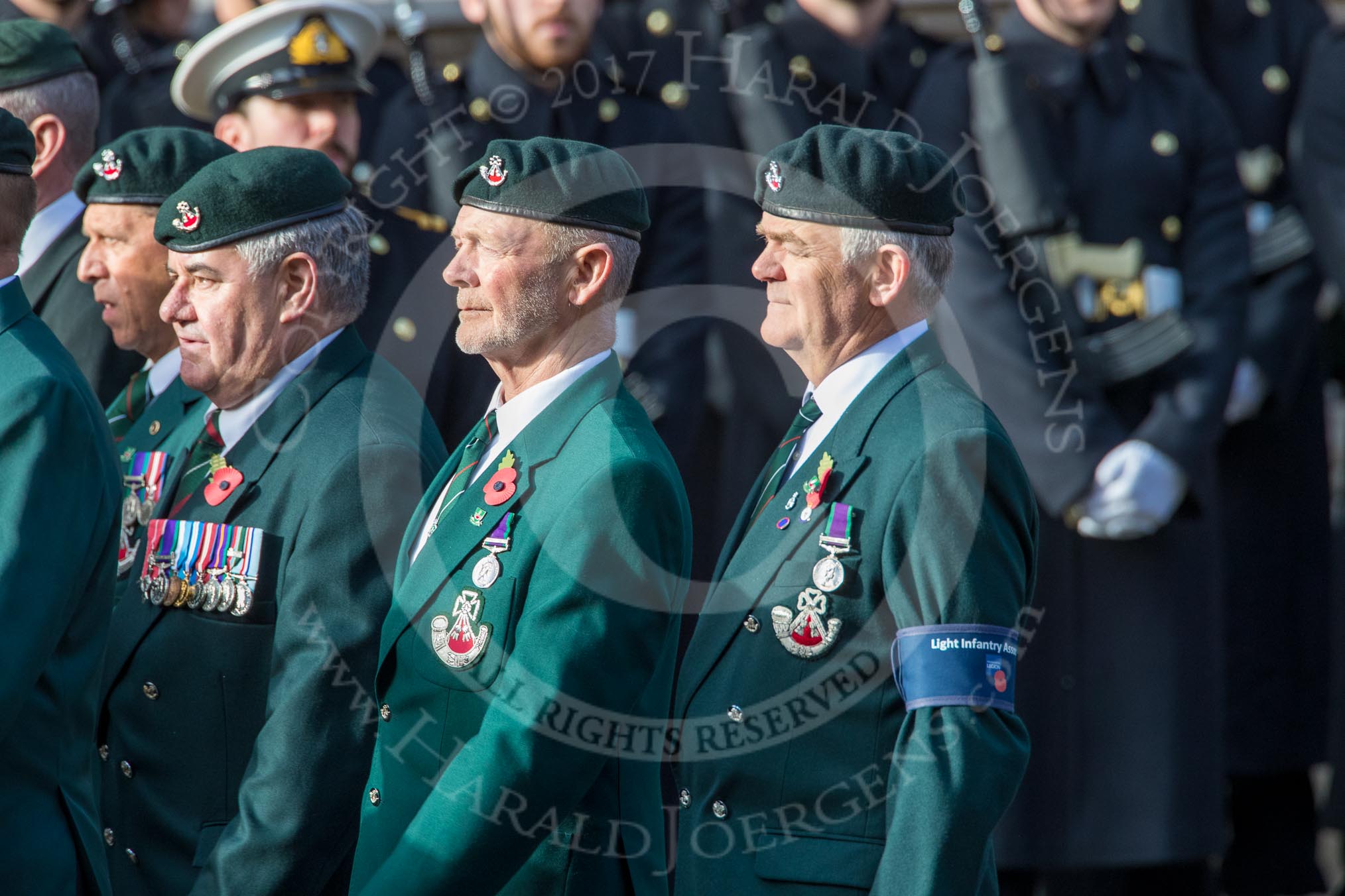 The Light Infantry Association (Group A4, 26 members) during the Royal British Legion March Past on Remembrance Sunday at the Cenotaph, Whitehall, Westminster, London, 11 November 2018, 11:56.