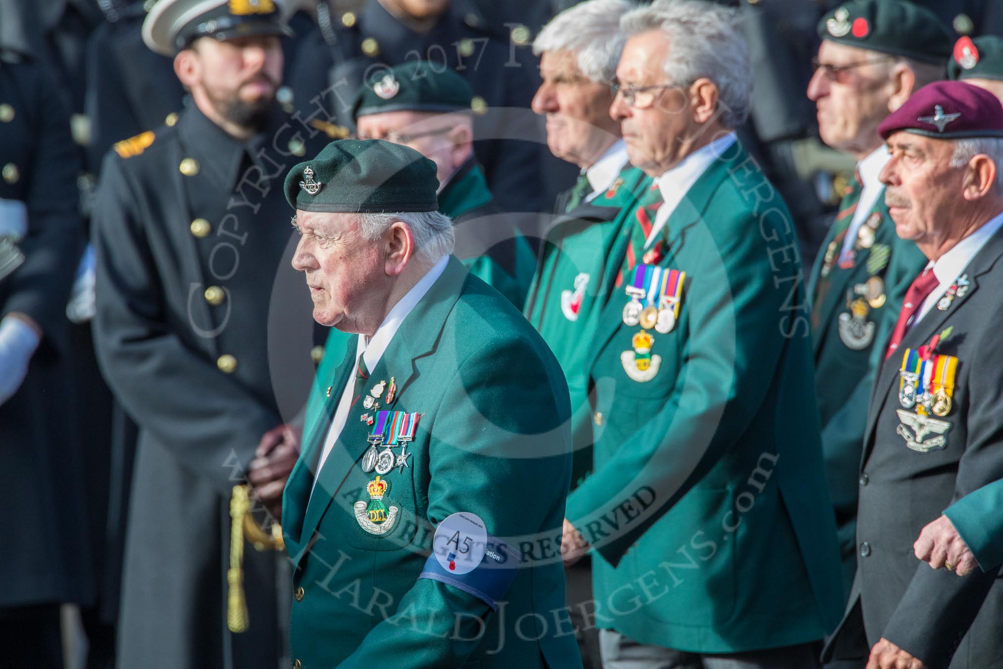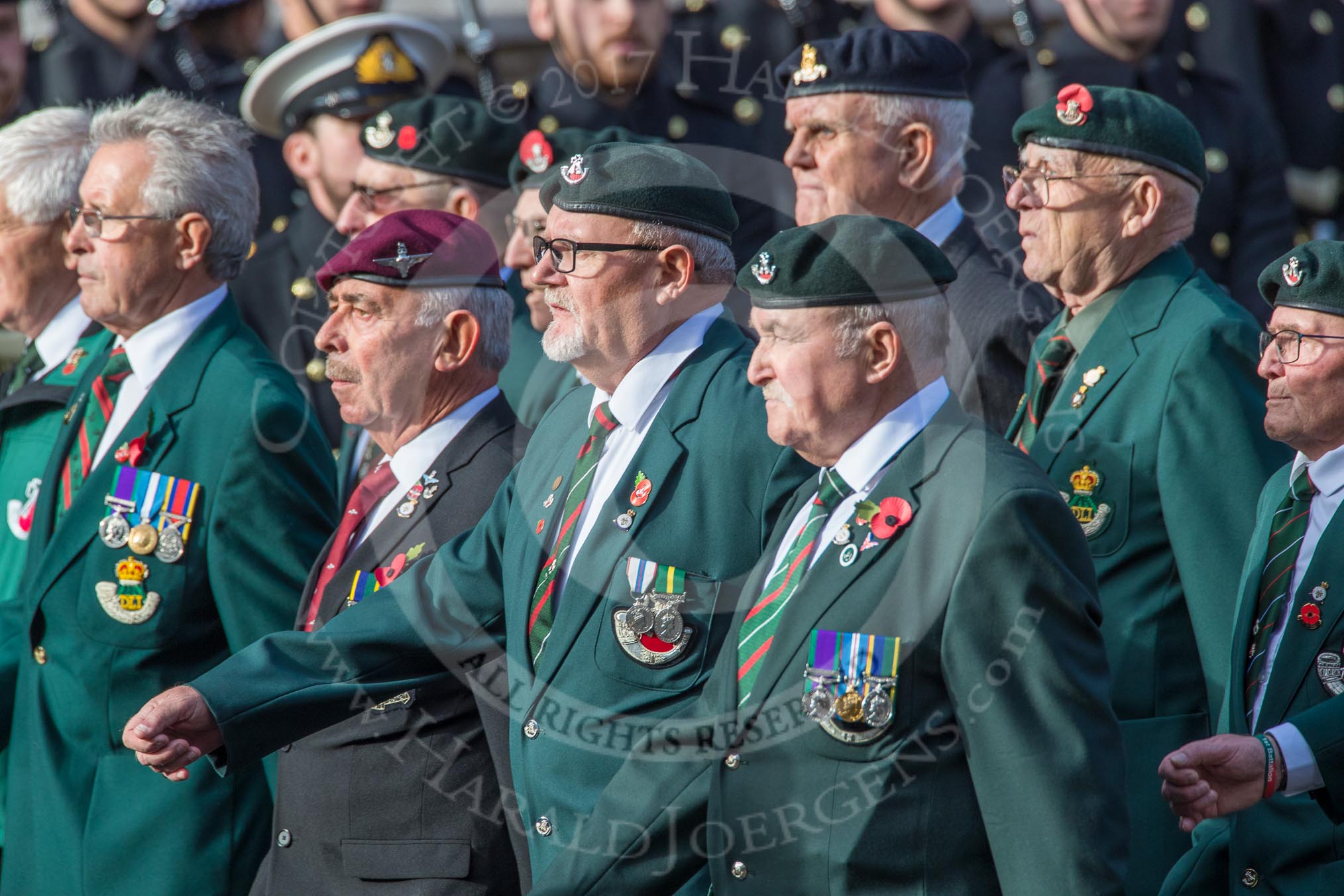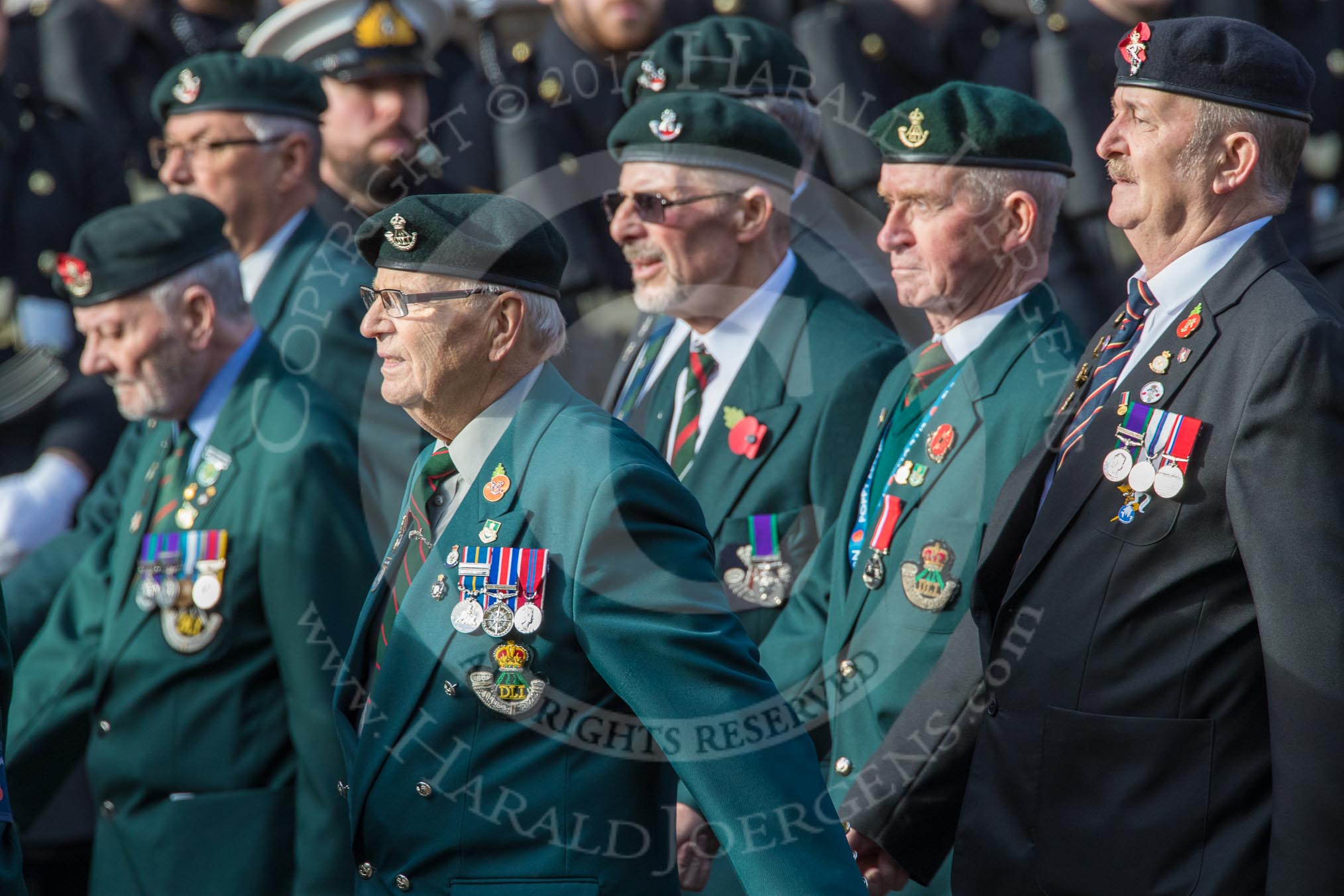 Durham Light Infantry Association (Group A5, 27 members) during the Royal British Legion March Past on Remembrance Sunday at the Cenotaph, Whitehall, Westminster, London, 11 November 2018, 11:56.