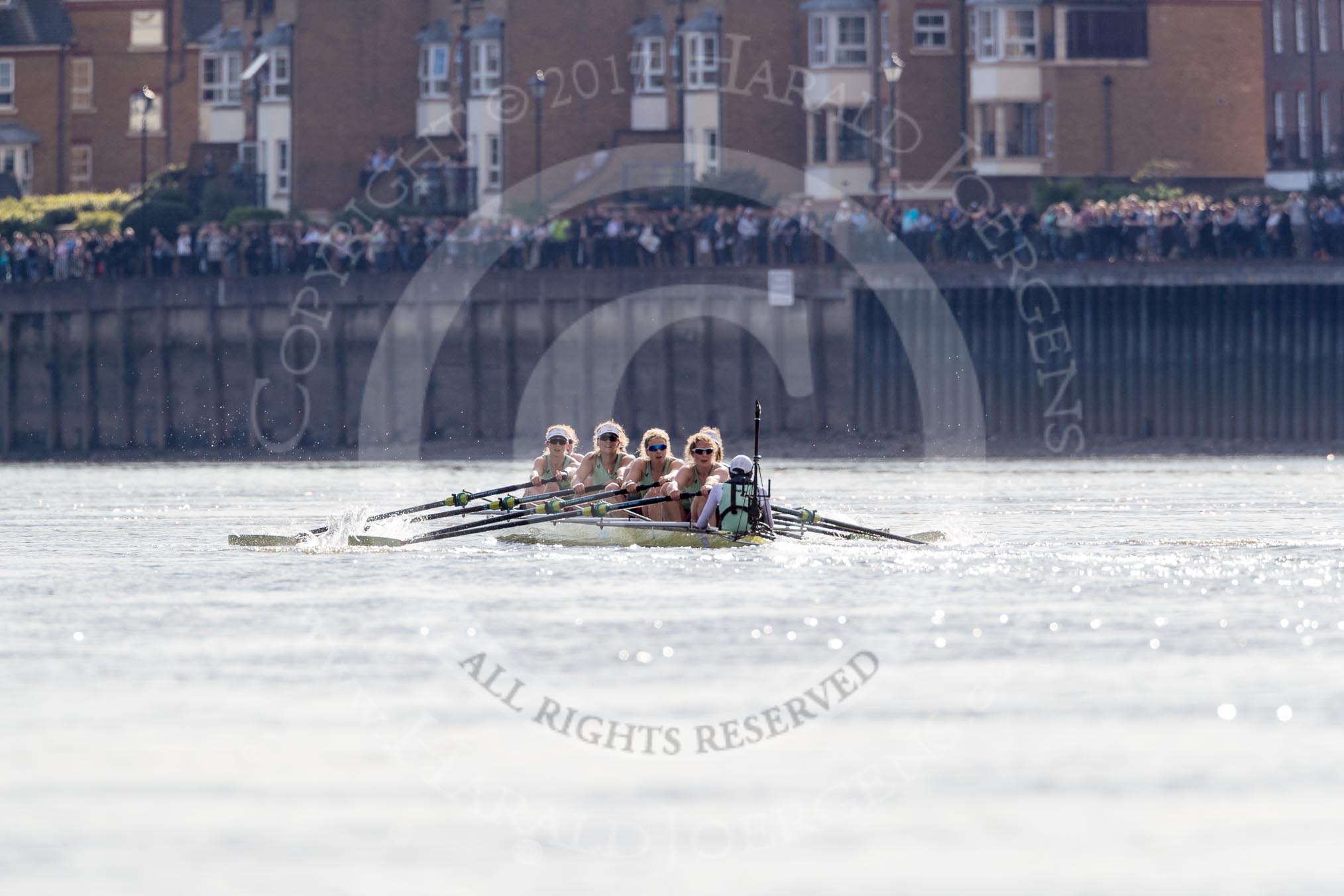 The Boat Race season 2017 - The Cancer Research Women's Boat Race: CUBWC in a comfortable lead in the sunshine - bow Ashton Brown, 2 Imogen Grant, 3 Claire Lambe, 4 Anna Dawson, 5 Holly Hill, 6 Alice White, 7 Myriam Goudet, stroke Melissa Wilson, cox Matthew Holland. River Thames between Putney Bridge and Mortlake, London SW15, United Kingdom, on 02 April 2017 at 16:45, image #166