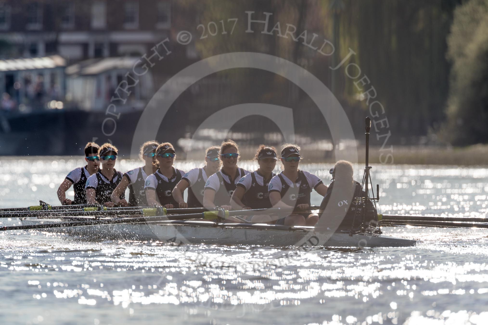 The Boat Race season 2017 - The Cancer Research Women's Boat Race: Oxford working hard to catch up with Cambridge in the afternoon sunshine. River Thames between Putney Bridge and Mortlake, London SW15, United Kingdom, on 02 April 2017 at 16:45, image #168