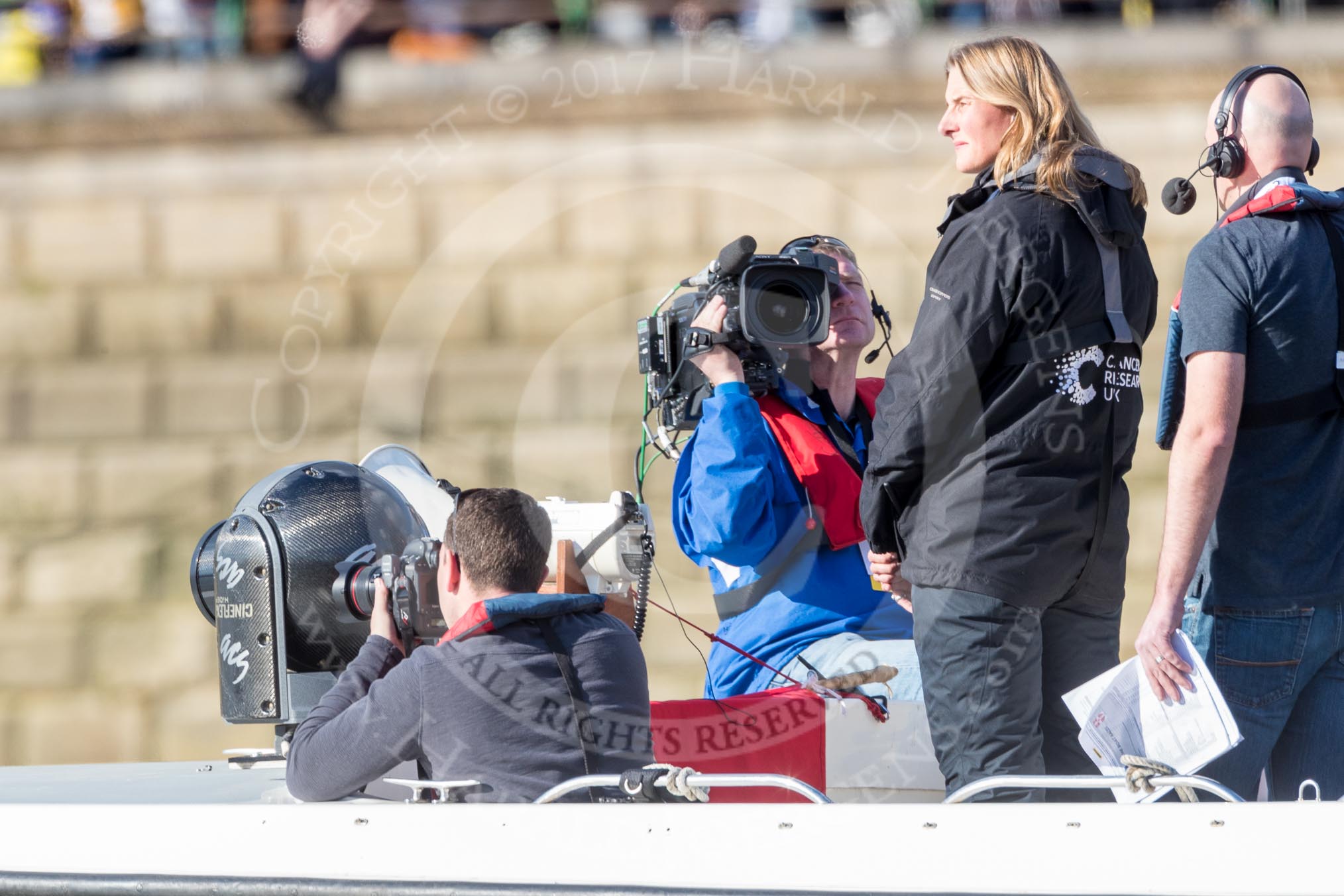 The Boat Race season 2017 - The Cancer Research Women's Boat Race: Umpire Sarah Winckless with a BBC crew on board of the umpire's launch. River Thames between Putney Bridge and Mortlake, London SW15, United Kingdom, on 02 April 2017 at 16:34, image #117