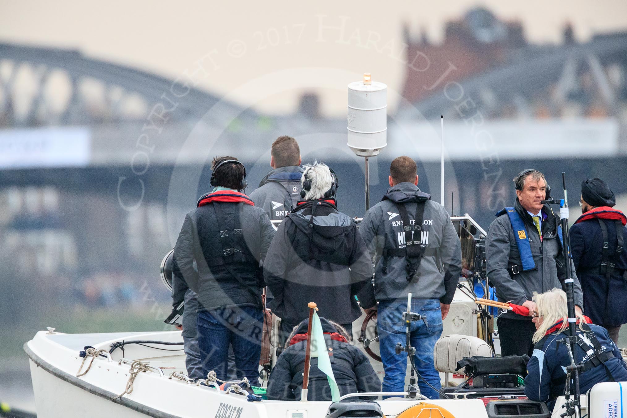 The Cancer Research UK Women's Boat Race 2018: The umpire's launch, with race umpire Sire Matthew Pinsent in front.