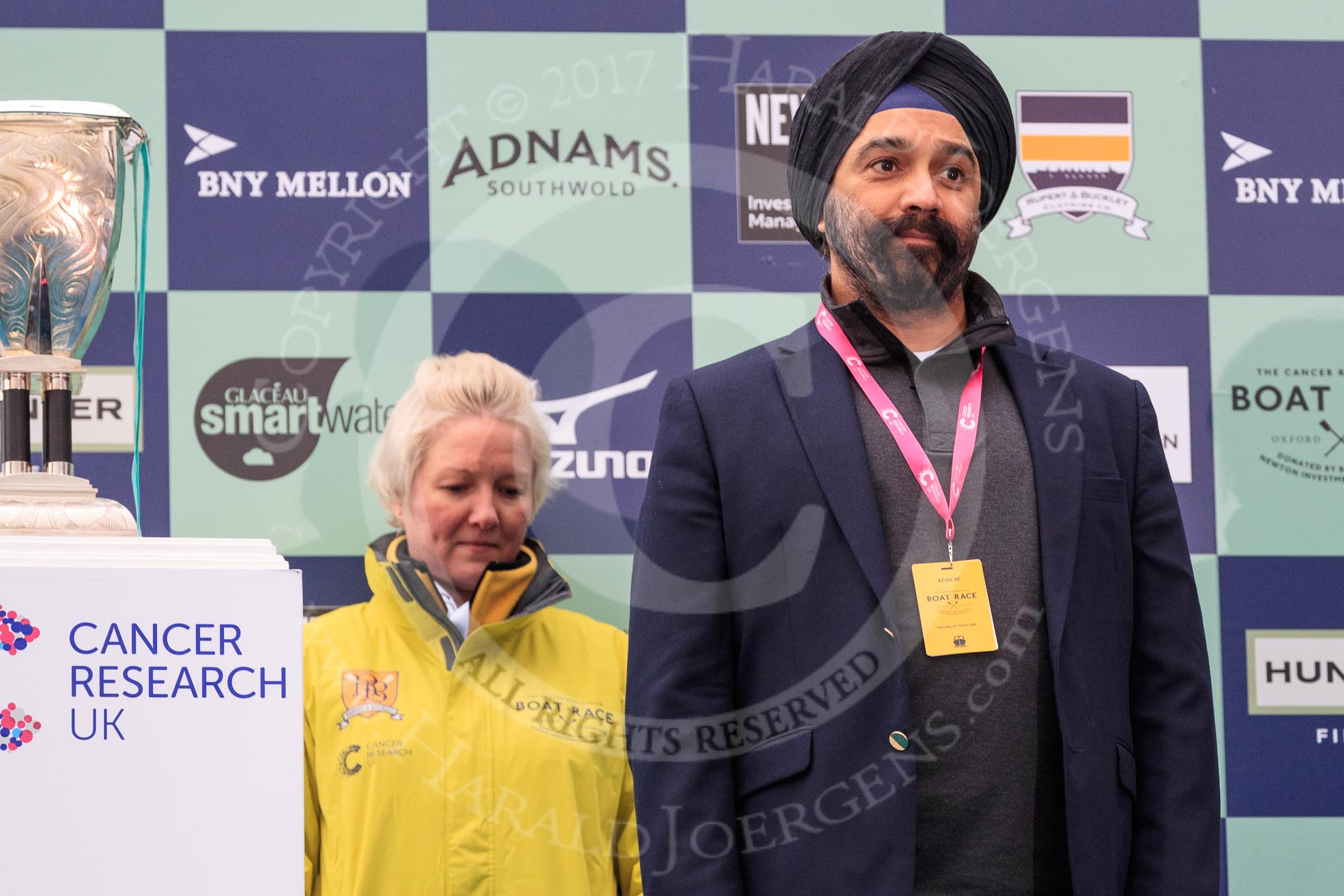 The Cancer Research UK Women's Boat Race 2018: Sir Harpal Kumar, CEO of Cancer Research UK. with the Women's Boat Race trophy.