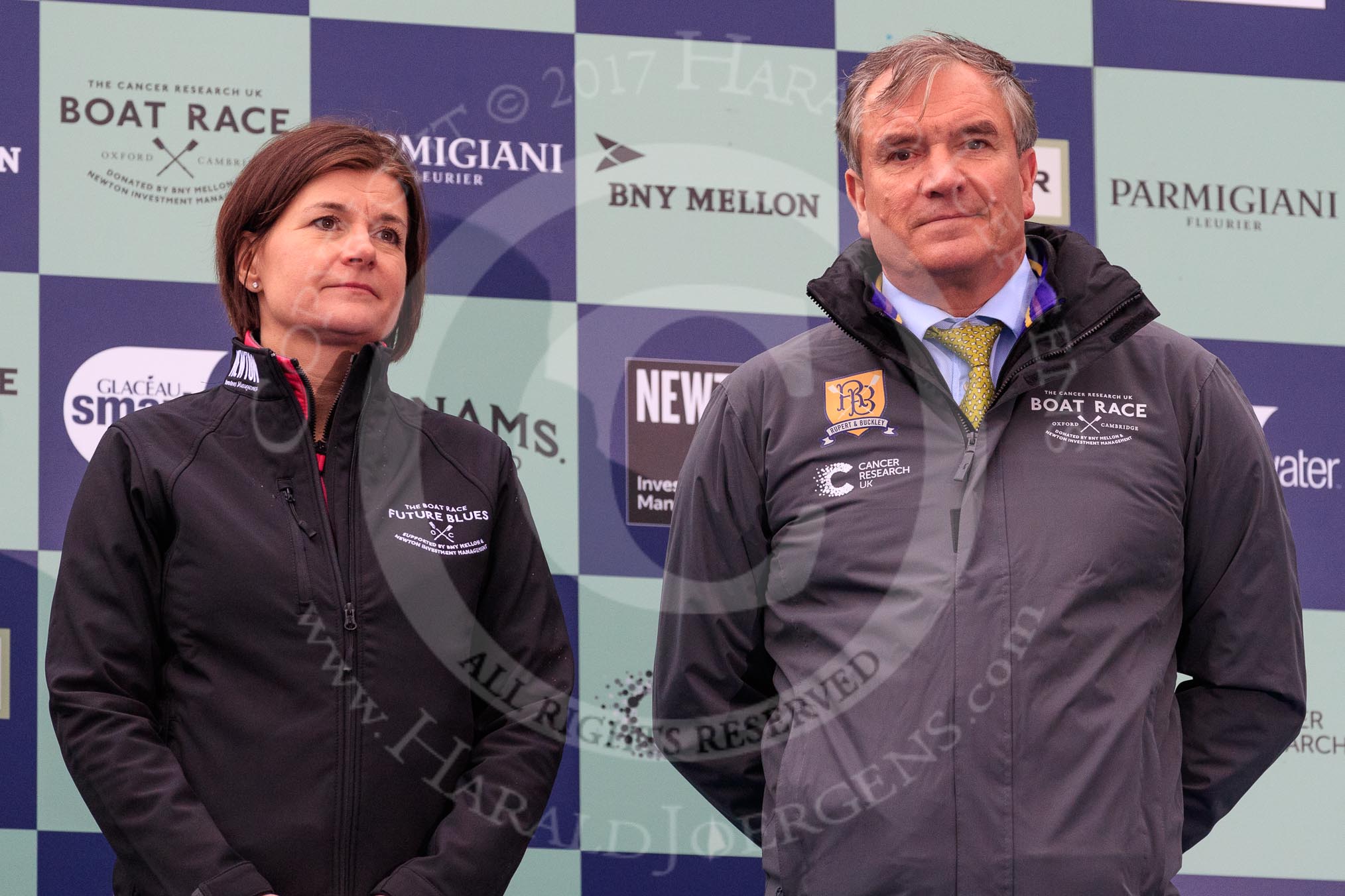 The Cancer Research UK Women's Boat Race 2018: Hanneke Smits, CEO of Newton Investments, and Fergus Murison, director of the Boat Rave Company, at the Women's Boat Race trophy presentation.