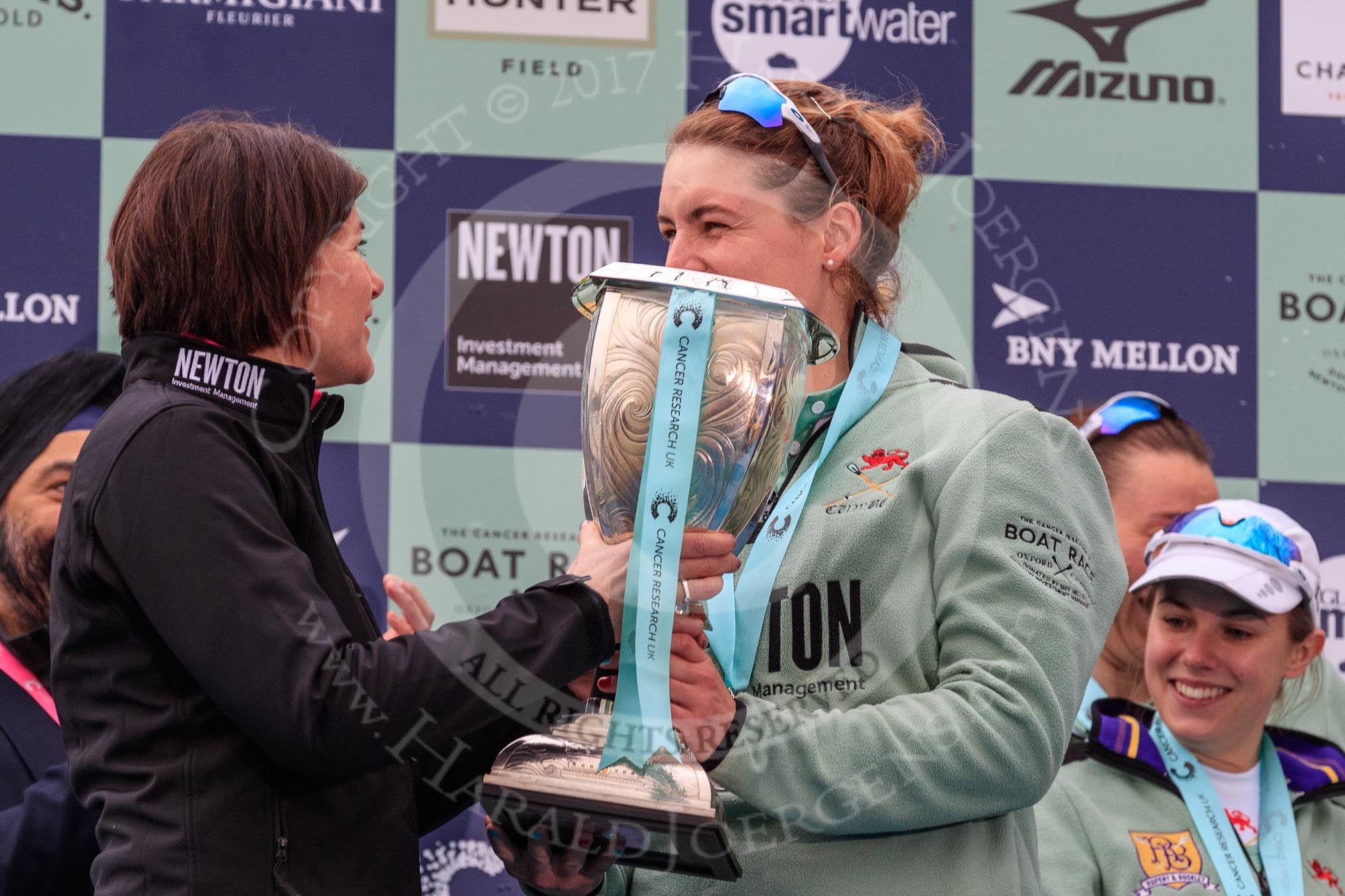 The Cancer Research UK Women's Boat Race 2018: Newton Investment CEO Hanneke Smits handing the Women's Boat Race trophy to Cambridge 7 seat Myriam Goudet-Boukhatmi whilst the first Champagne bottles are opened. On the left, taking cover, Cancer Research CEO Sir Harpal Kumar, on the right Cambridge cox Sophie Shapter.