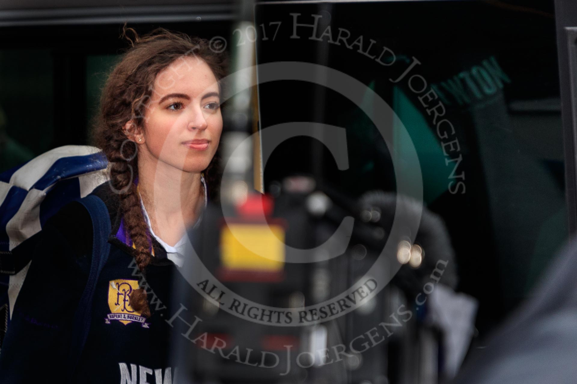 The Cancer Research UK Women's Boat Race 2018: The arrival of the Oxford reserve boat crew, here cox Sophie Wrixon.