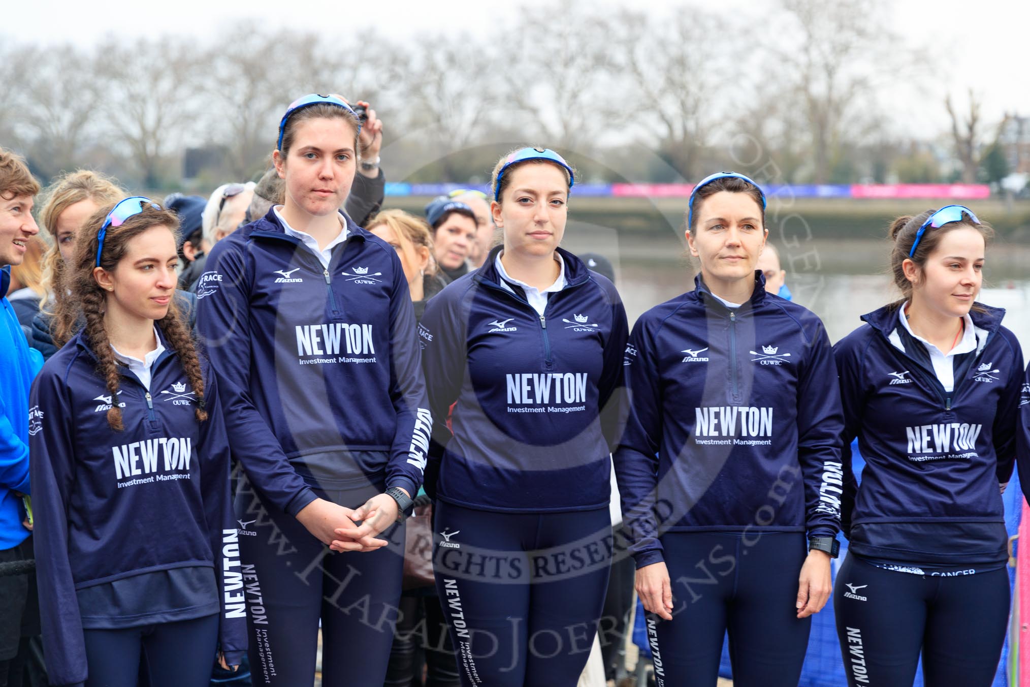 The Cancer Research UK Women's Boat Race 2018: The toss for the Women's Boat Race reserve boats, here, almost hidden, CUWBC president, and 5 seat Daphne Martschenko, then 2 seat Emma Andrews, 3 Anne Beenken, 4 Laura Foster, 6 Larkin Sayre, 7 Lucy Pike, stroke Millie Perrin, cox Sophie Wrixon.