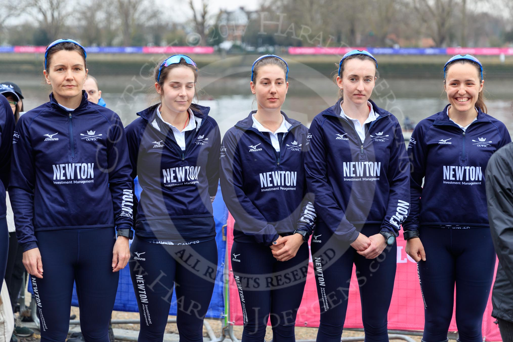 The Cancer Research UK Women's Boat Race 2018: The crew of Oxford reserve boat Osiris at the toss - cox Eleanor Shearer, 7 seat Olivia Pryer, 6 Sanja Brolih, 5 Sarah Payne Riches, 4 Rachel Anderson, 3 Madeline Goss, 2 Laura Depner, bow Matlida Edwards, Zahara Alacia, the young lady that will throw the coin, and stroke Anna Murgatroyd.