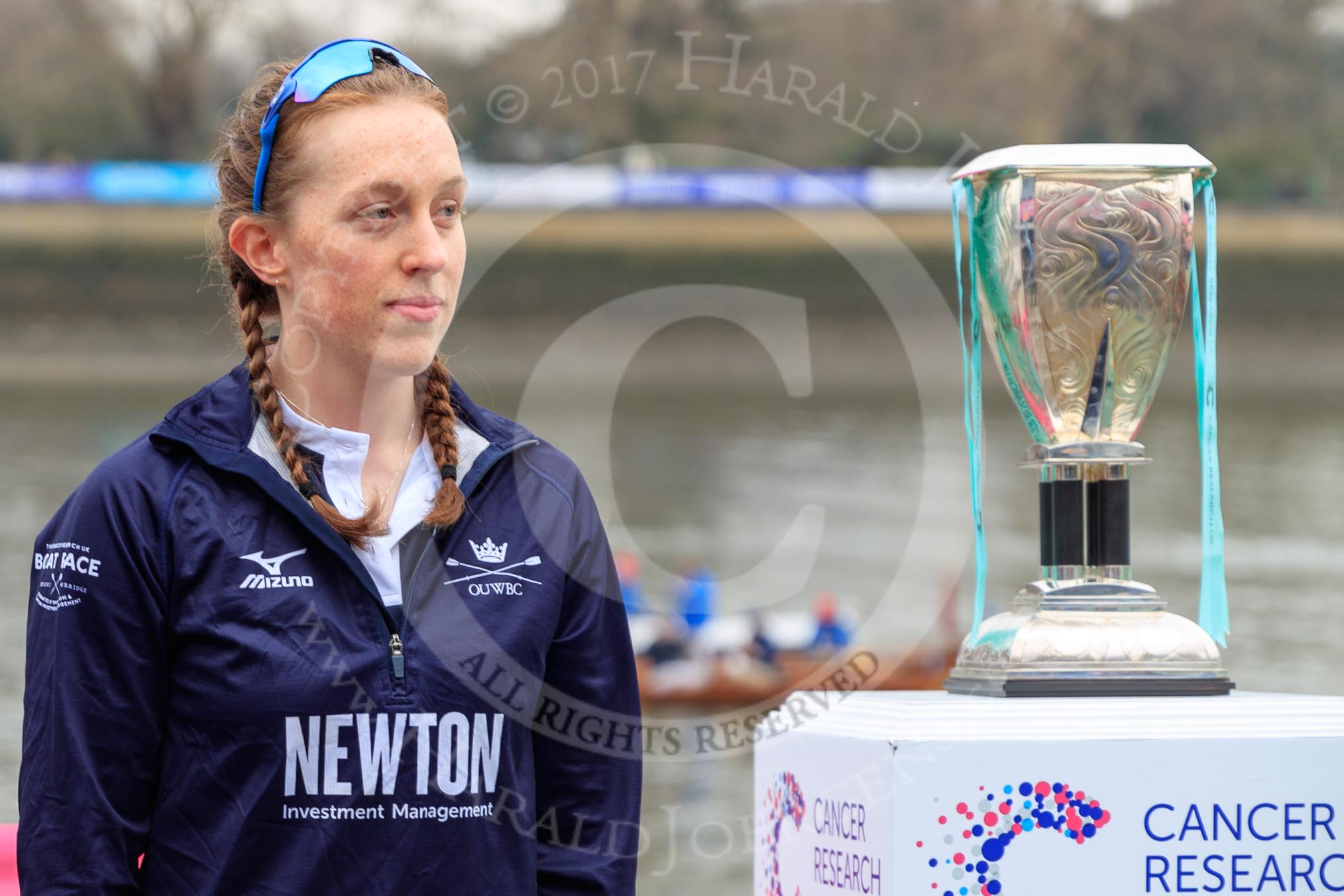 The Cancer Research UK Women's Boat Race 2018: Zahara Alacia, the young lady throwing the coin at the reserve boat toss, with Oxford stroke Anna Murgatroyd on the left, and Cambridge president Daphne Martschenko on the right of the Women's Boat Race trophy.