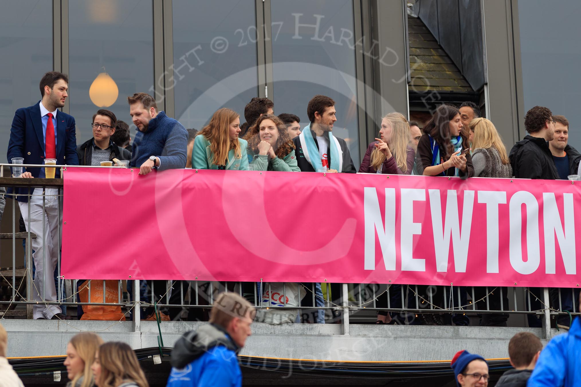 The Cancer Research UK Women's Boat Race 2018: Spectators on the balcony of the Thames RC boathouse.