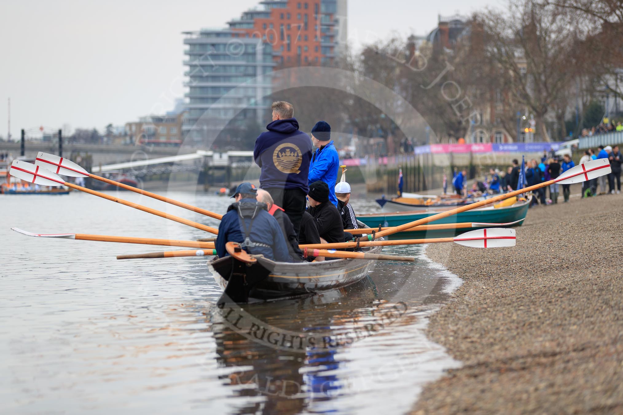 The Cancer Research UK Women's Boat Race 2018: The reserve boat toss - here, for Cambridge's Blondie, CUWBC president Daphne Martschenko, behind her bow seat Pippa Dakin, then 2 Emma Andrews, 3 Anne Beenken, 4 Laura Foster.