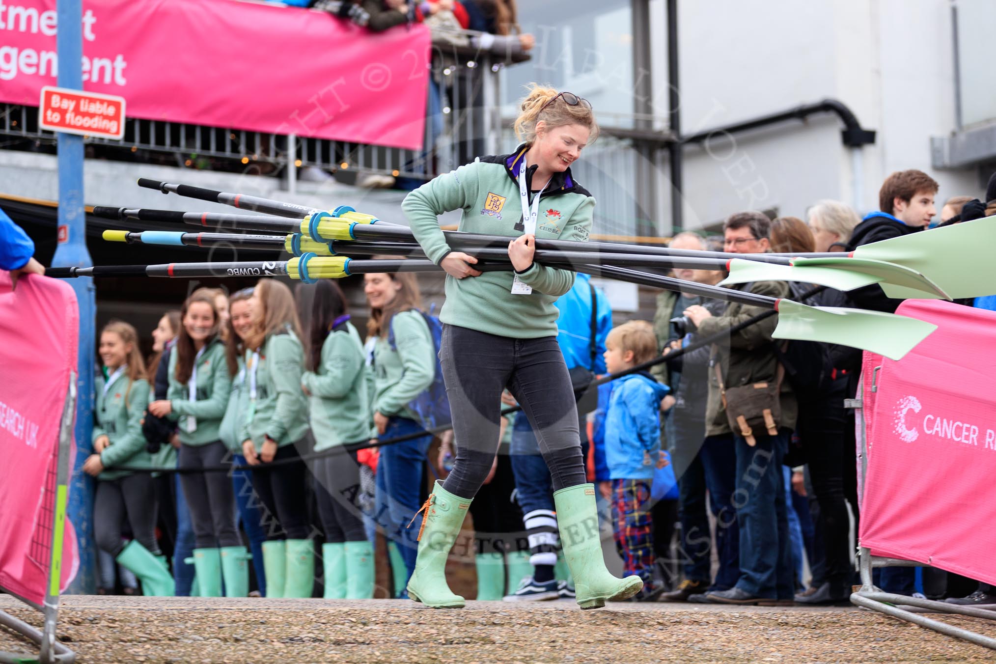 The Cancer Research UK Women's Boat Race 2018: Watching the Cambridge women leaving the boathouse.