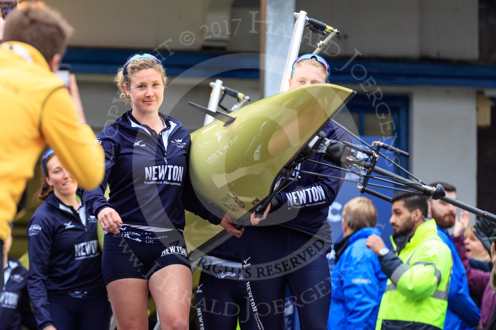 The Cancer Research UK Women's Boat Race 2018: THe Oxford boat, with the BBC camera assembly mounted on the rear, is carried out of the boathouse, In front stroke Beth Bridgman.