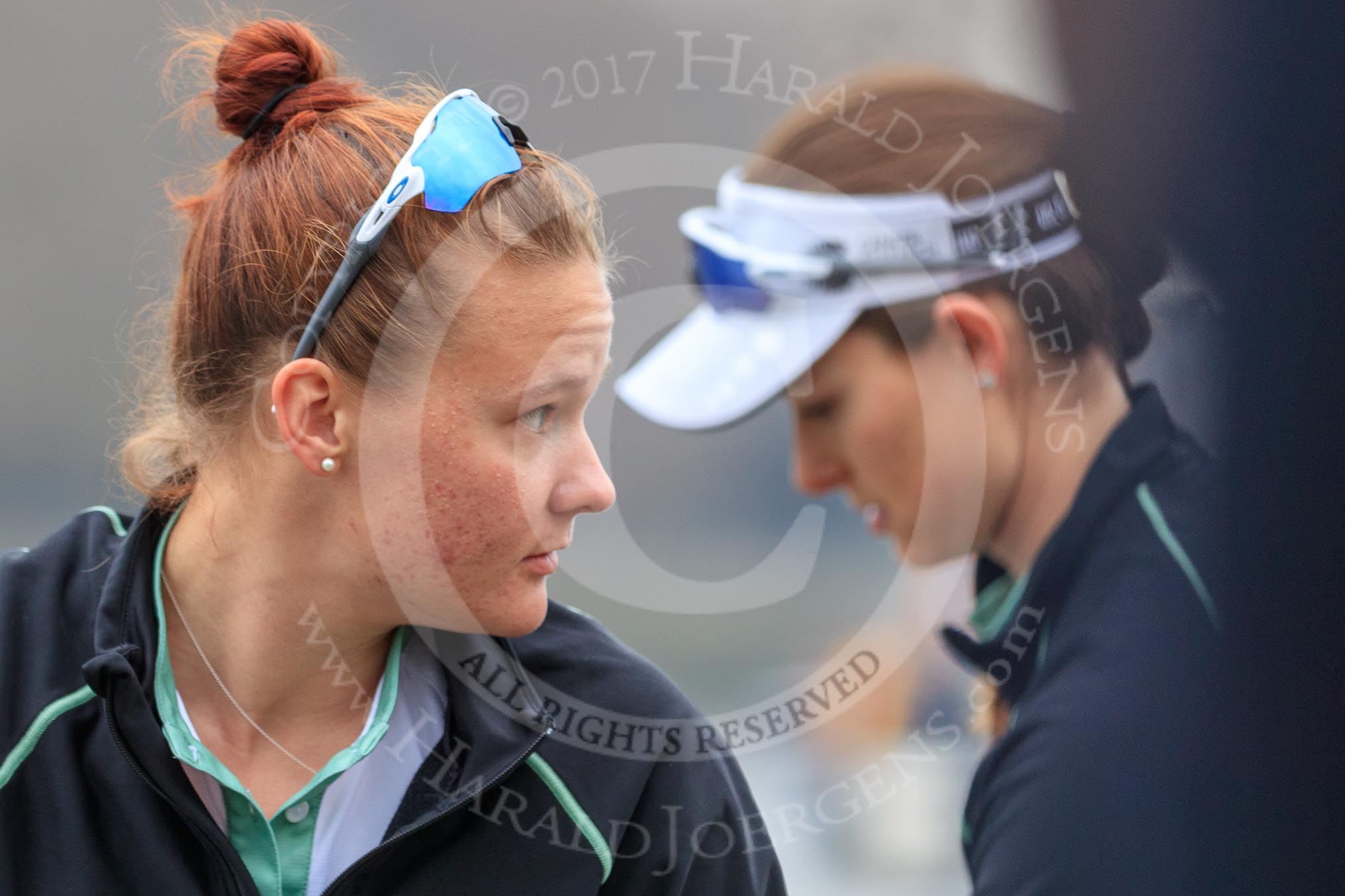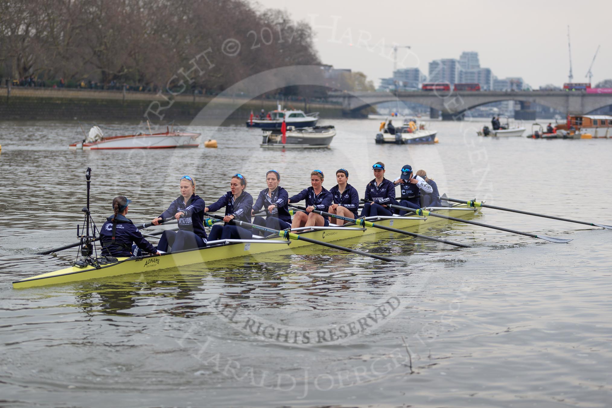 The Cancer Research UK Women's Boat Race 2018: The Oxford Blue Boat crew leaving the boathouse area - cox Jessica Buck, stroke Beth Bridgman, 7 Abigail Killen, 6 Sara Kushma, 5 Morgan McGovern, 4 Alice Roberts, 3 Juliette Perry, 2 Katherine Erickson, bow Renée Koolschijn.