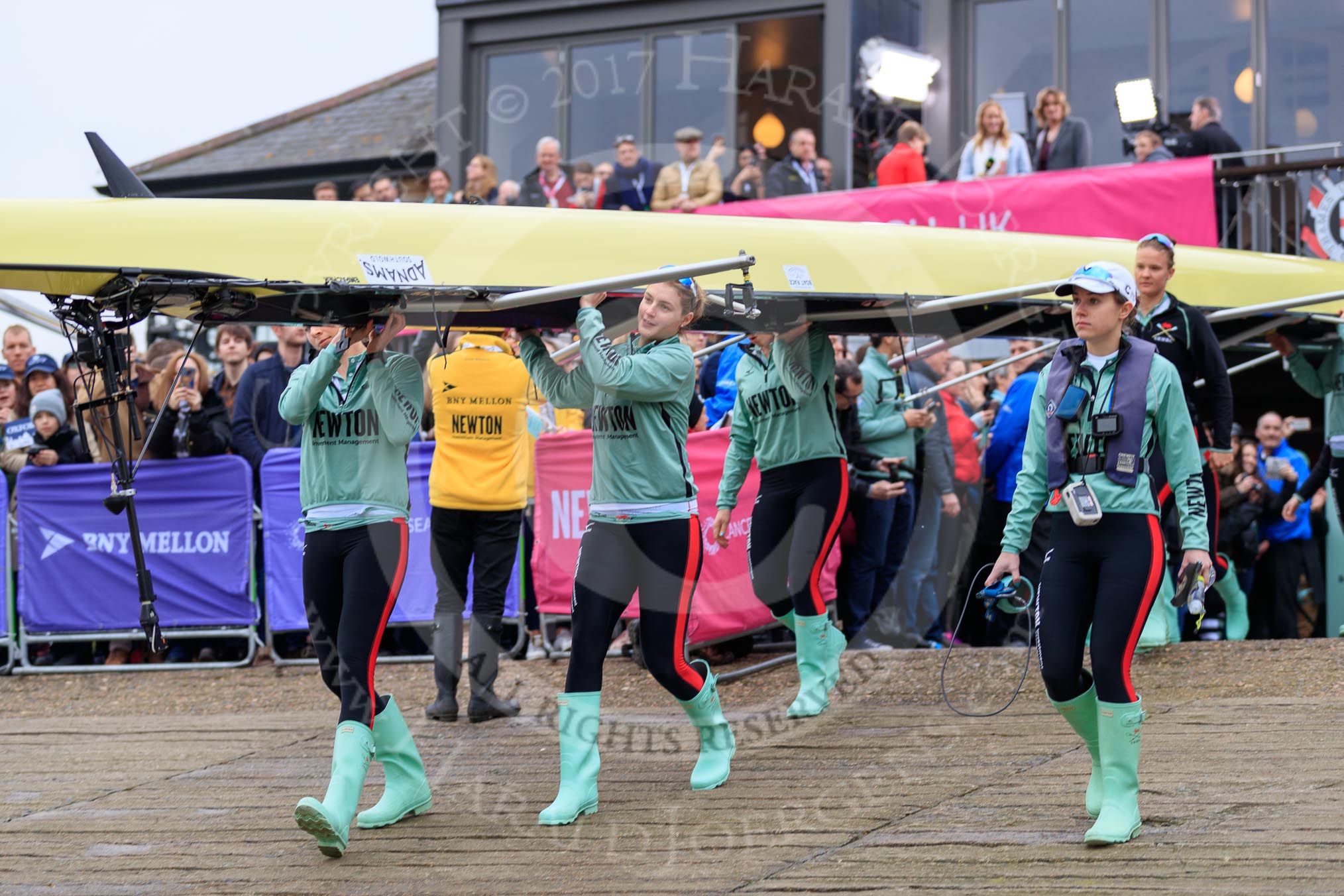 The Cancer Research UK Women's Boat Race 2018: The Cambridge Blue Boat crew carrying their boat from the boathouses to the river.