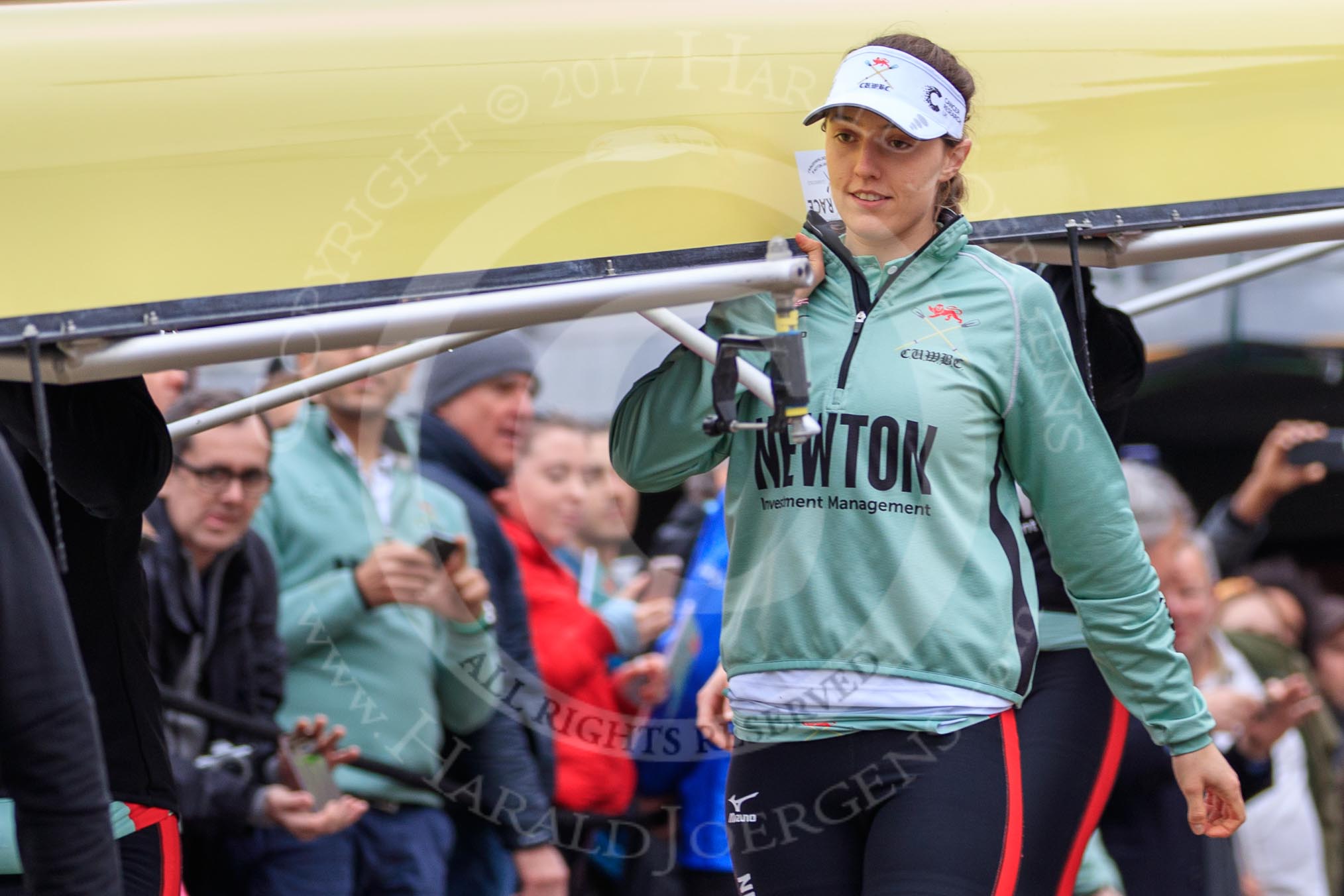 The Cancer Research UK Women's Boat Race 2018: The Cambridge Blue Boat crew carrying their boat from the boathouses to the river, here 3 seat Kelsey Barolak.