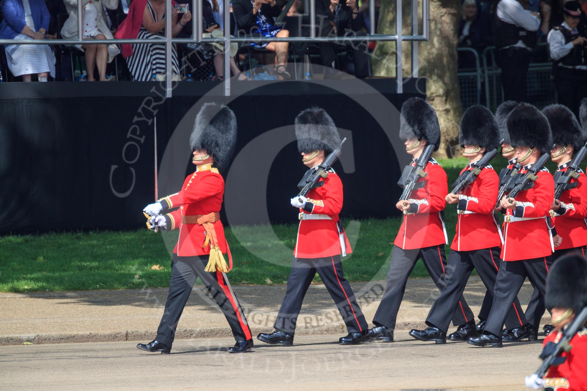 Number Four Guard, No 7 Company Coldstream Guards, led by The Subaltern, Captain James Potter (27), marching behind Number Five Guard, Nijmegen Company, Grenadier Guards during Trooping the Colour 2018, The Queen's Birthday Parade at Horse Guards Parade, Westminster, London, 9 June 2018, 10:27.